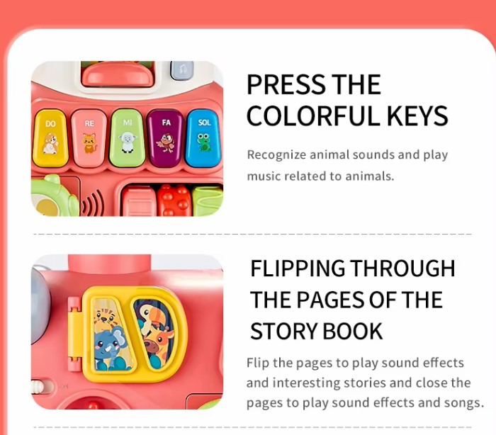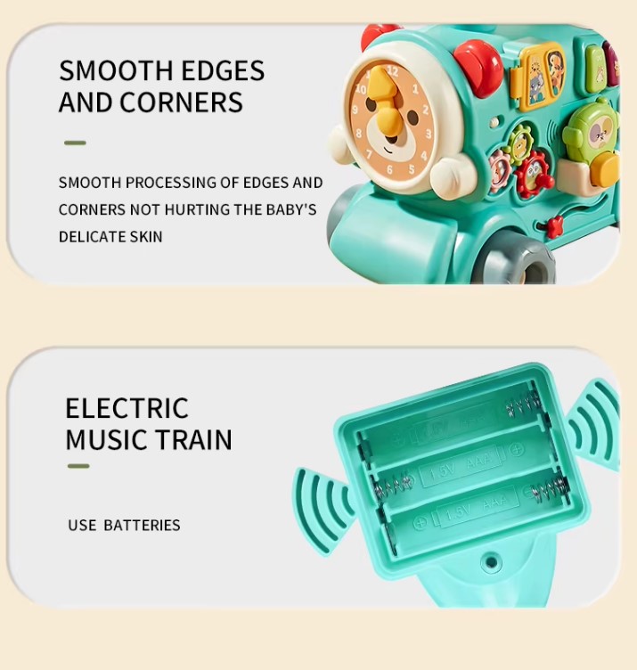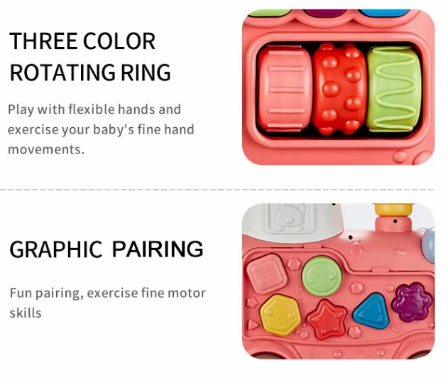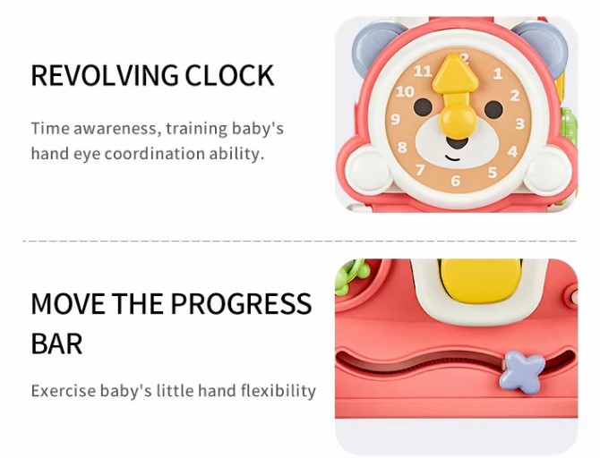 Designul său colorat și robust atrage atenția bebelușilor, stimulând curiozitatea, echilibrul și abilitățile motrice fine, în timp ce diversele elemente educative încurajează învățarea timpurie prin joacă.