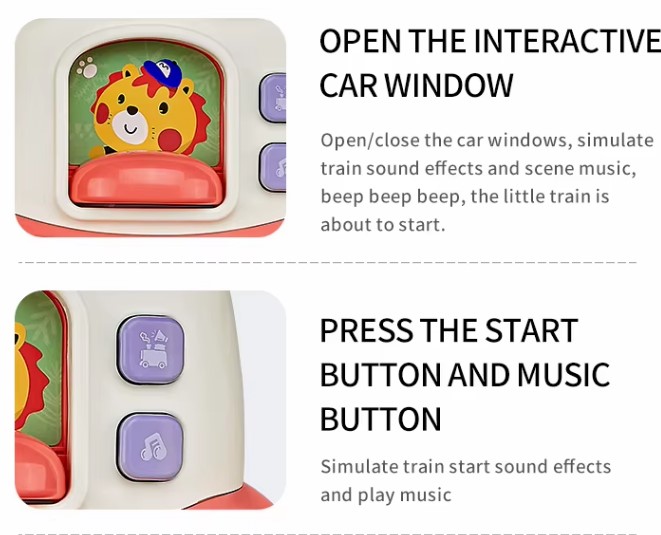 Butoanele interactive redau melodii, sunete de tren și povești, dezvoltând auzul și atenția copiilor.