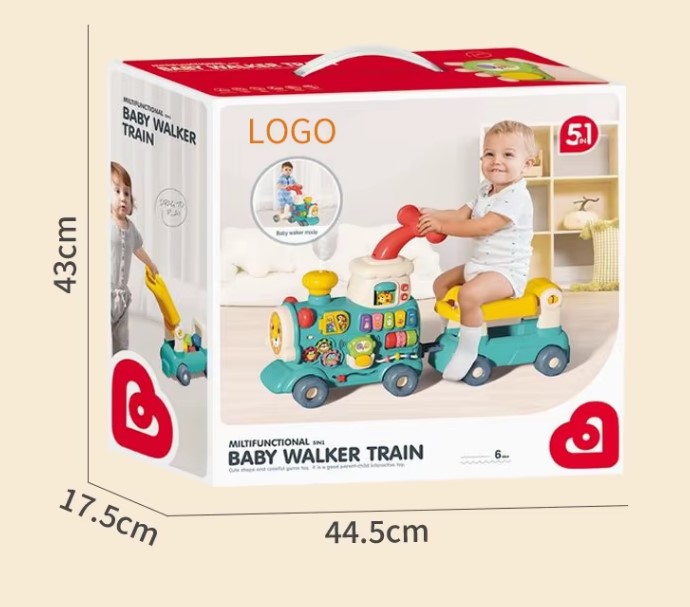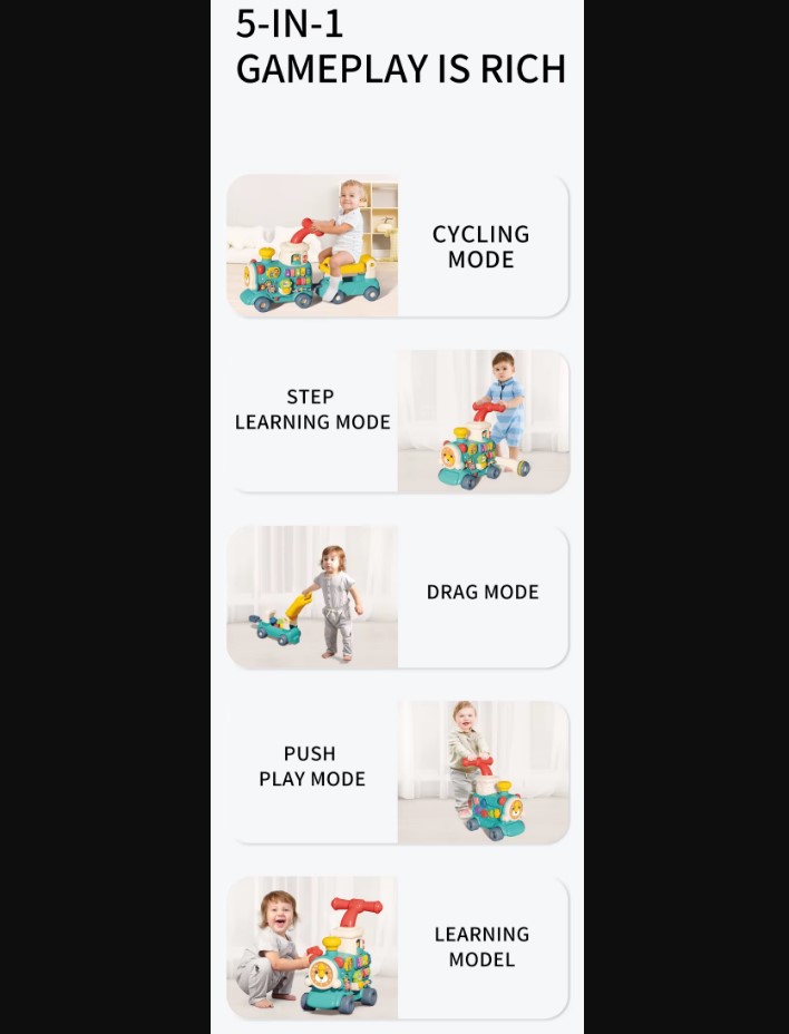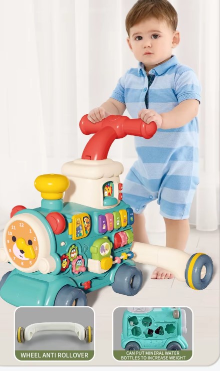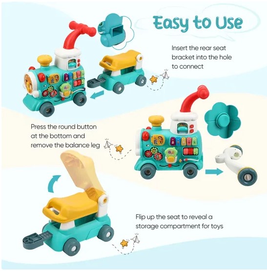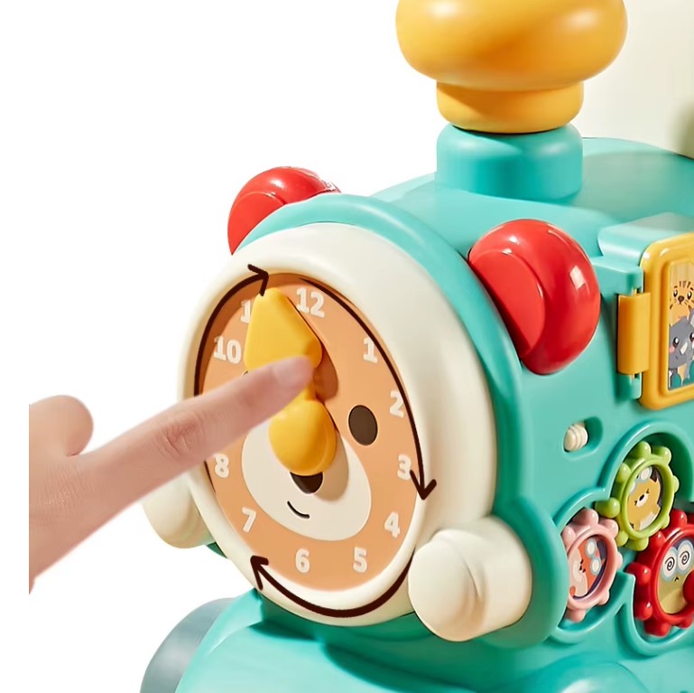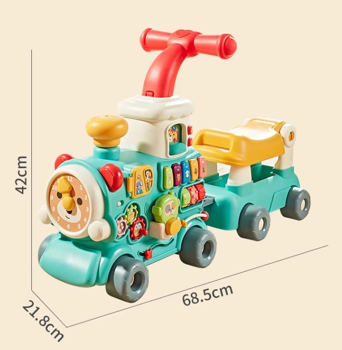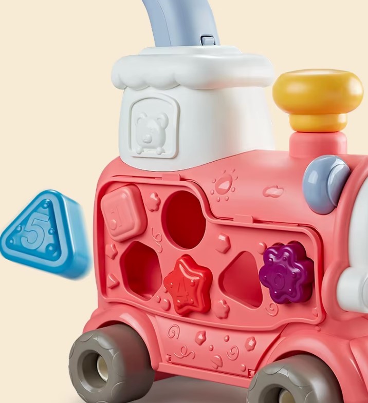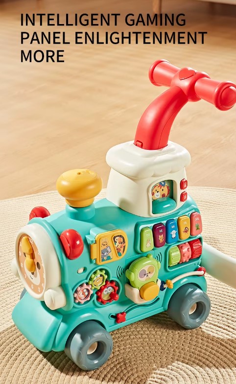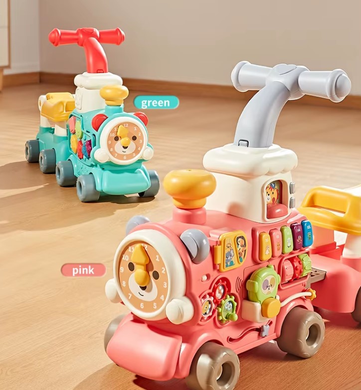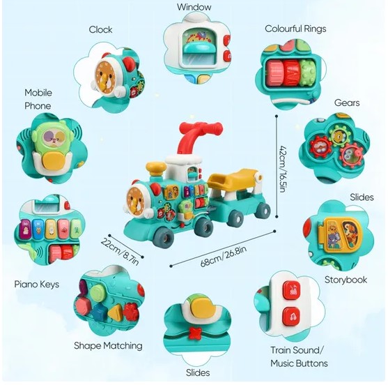 Acest antepremergător 5 în 1 combină distracția cu învățarea prin activități inspirate din pedagogia Montessori, oferind multiple funcții: jucărie de împins, tren de călărie, centru de activități educative, sortator de forme și jucărie muzicală cu aburi reali.