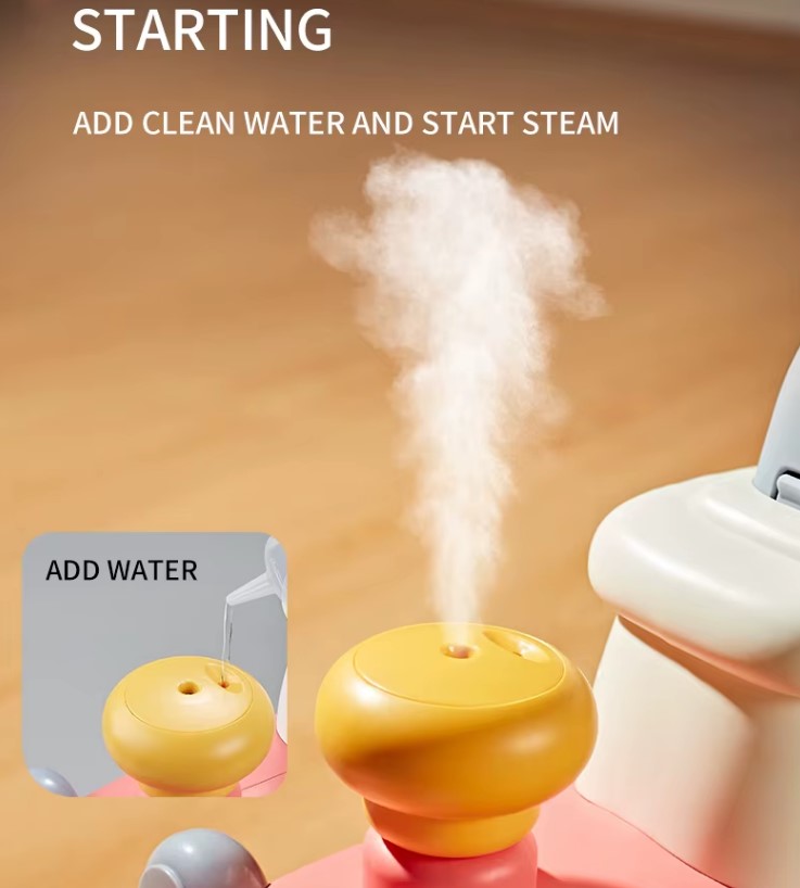 Se adaugă apă curată în compartimentul superior, iar trenulețul eliberează aburi reci pentru o experiență senzorială unică și sigură.