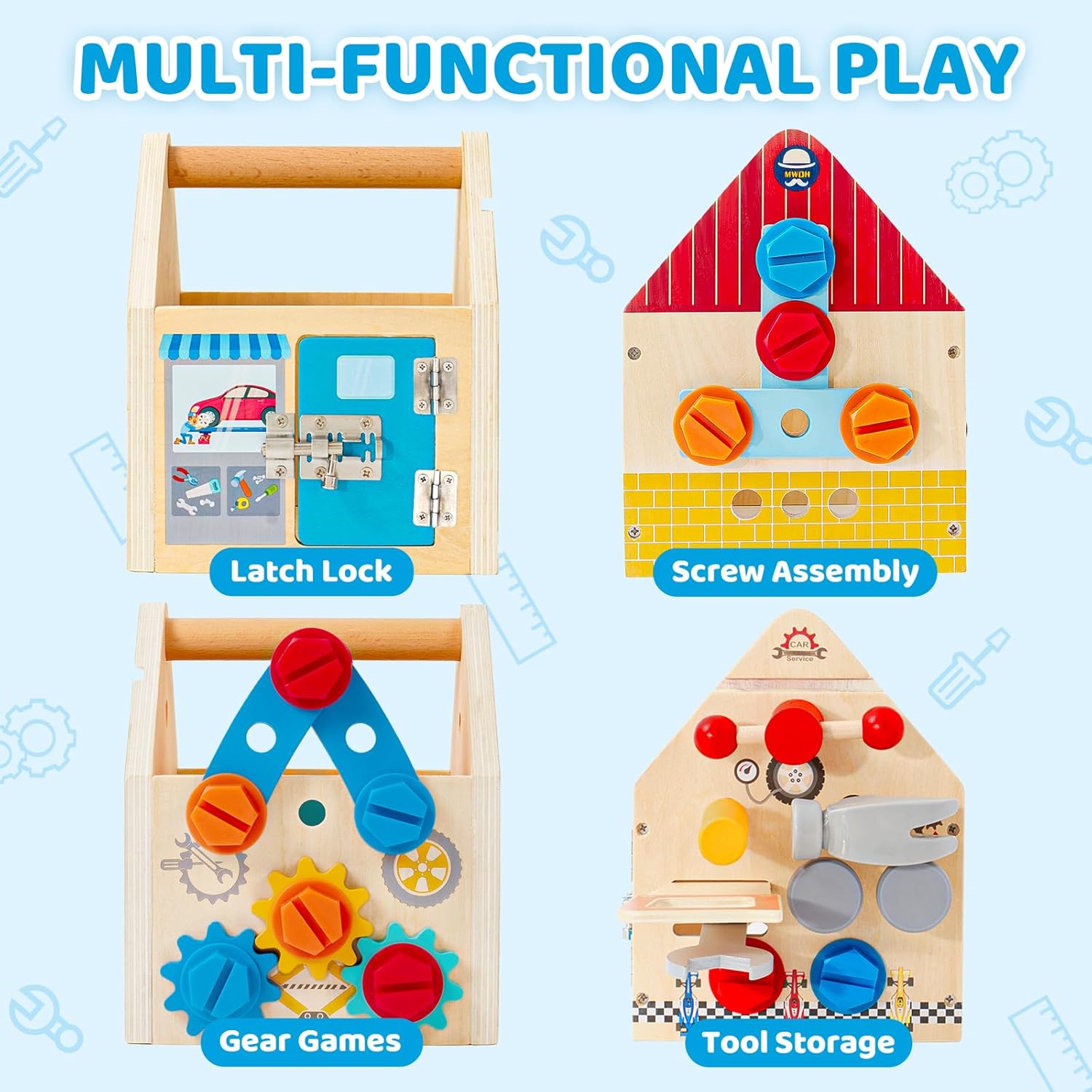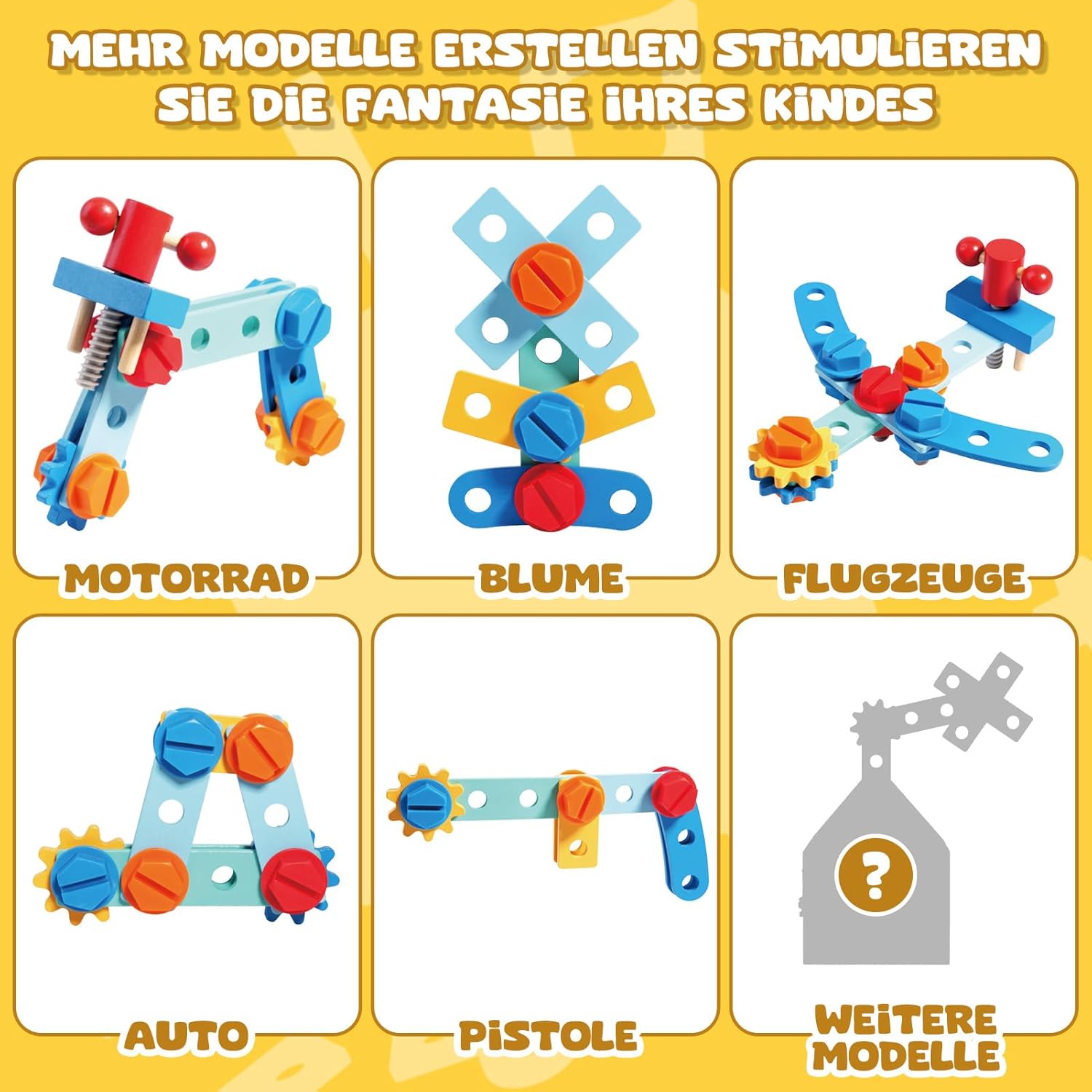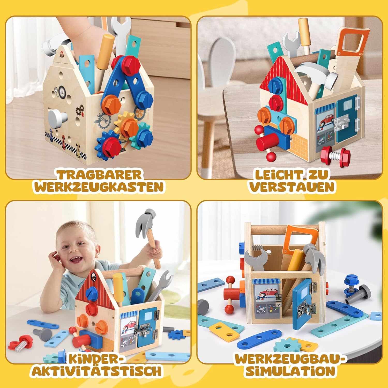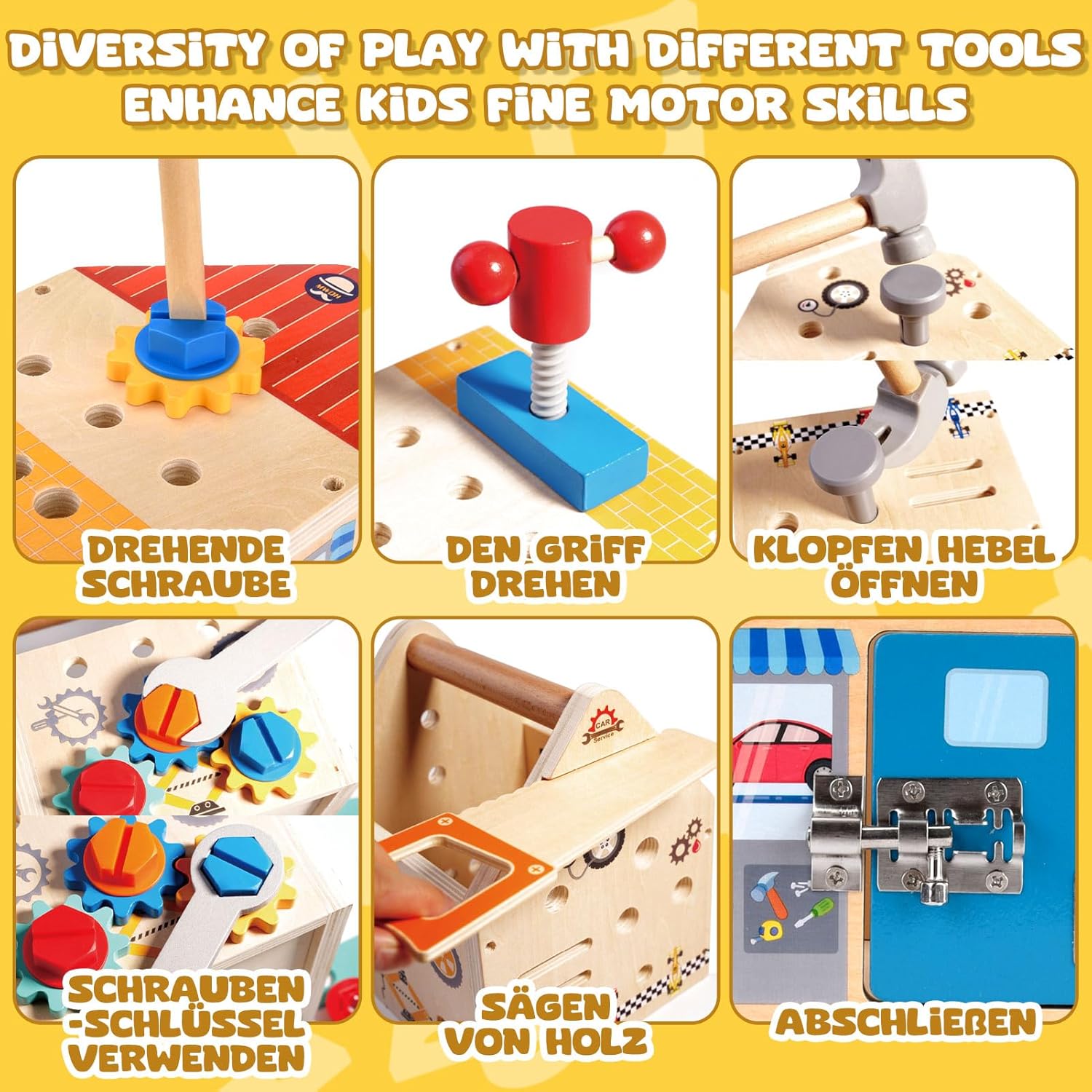 Copilul poate folosi uneltele incluse pentru a înșuruba, deșuruba, bate cu ciocanul sau fixa plăcuțele și rotițele.