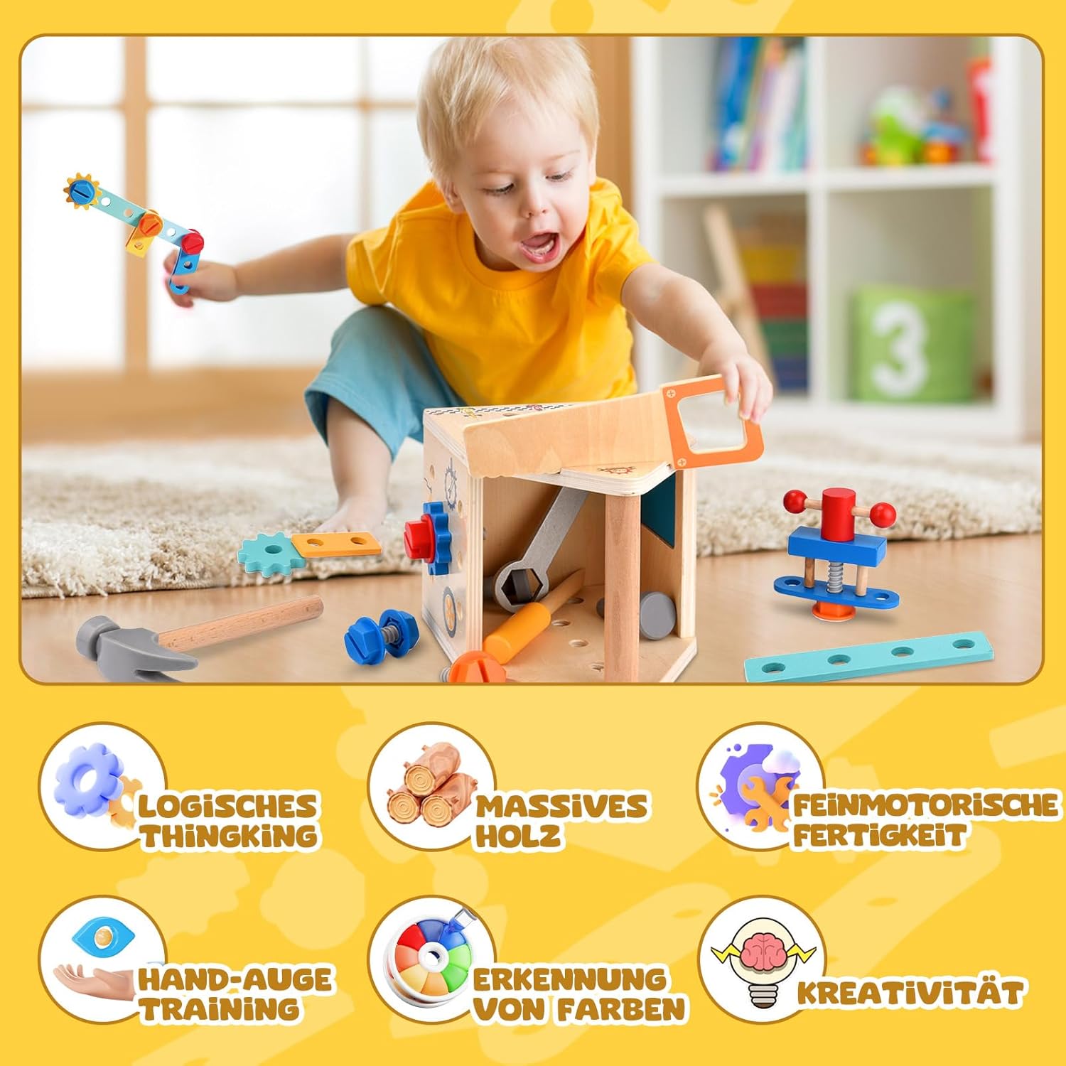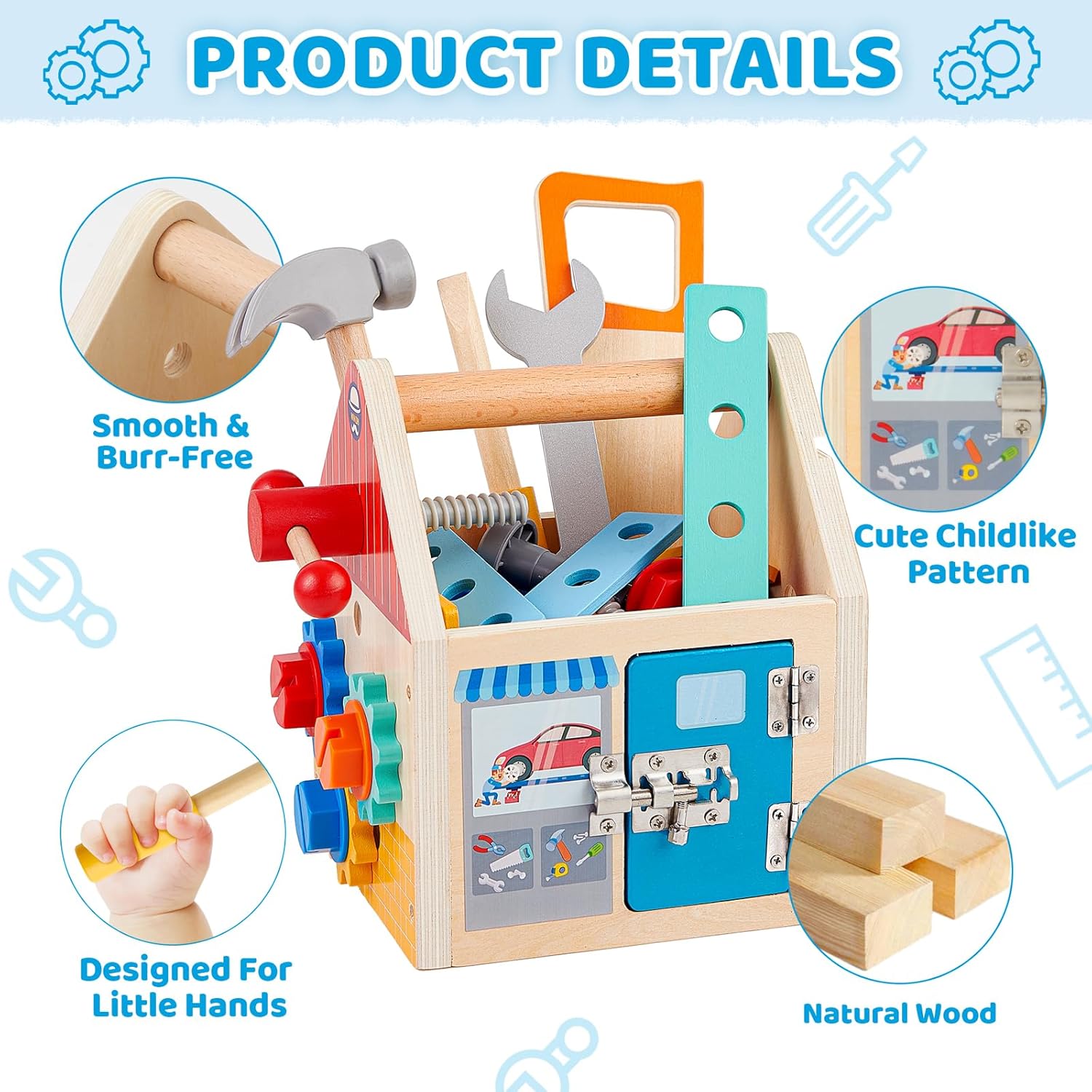 Acest banc de lucru educativ din lemn este un set complet pentru micii meșteri dornici să descopere lumea construcțiilor prin joacă creativă și practică. Realizat din lemn masiv, vopsit cu culori sigure, pe bază de apă, bancul include o varietate de unelte (ciocan, șurubelniță, cheie fixă, fierăstrău), șuruburi, piulițe, rotițe și plăcuțe cu găuri pentru asamblare.