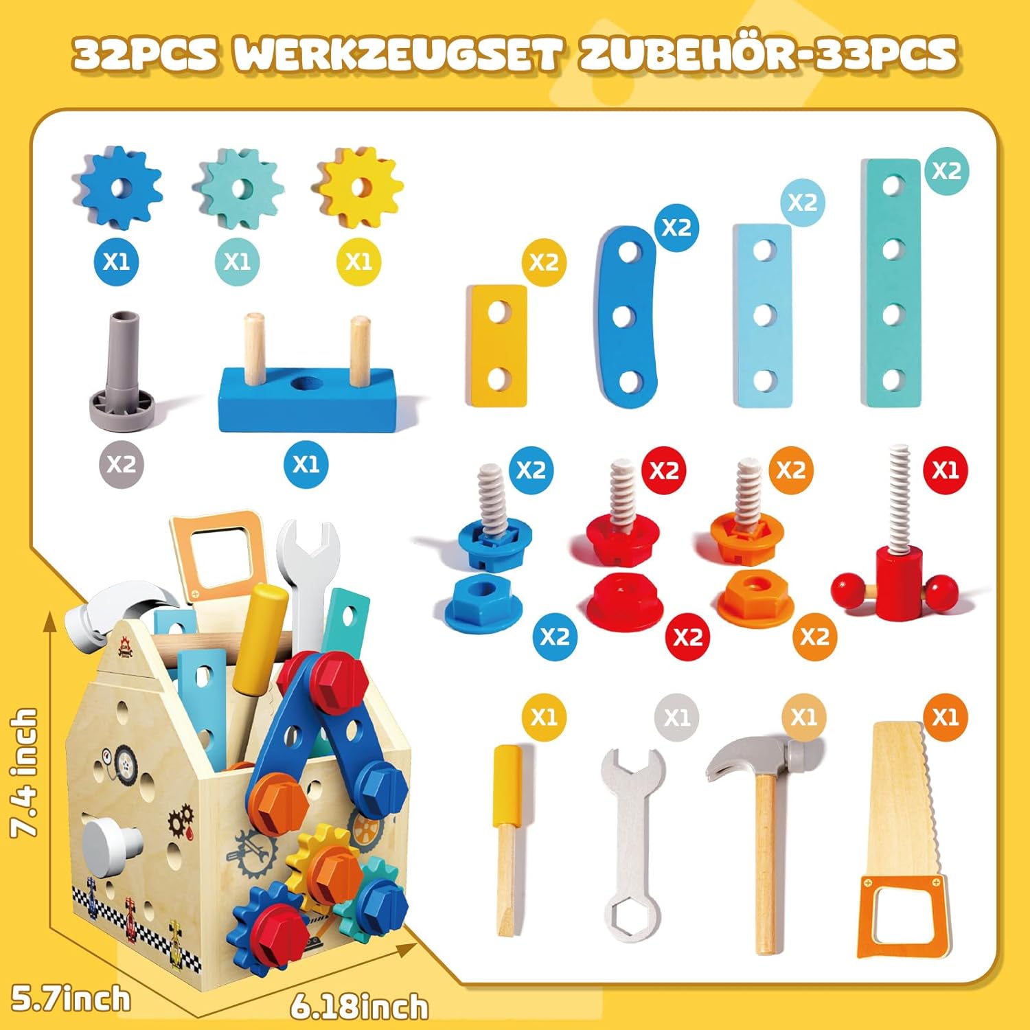 Conținut: 32-33 piese (banc de lucru tip căsuță, ciocan, șurubelniță, cheie fixă, fierăstrău, plăcuțe perforate, rotițe, șuruburi și piulițe colorate)