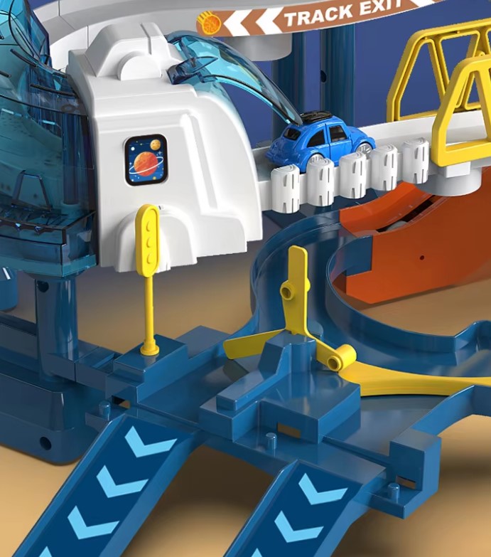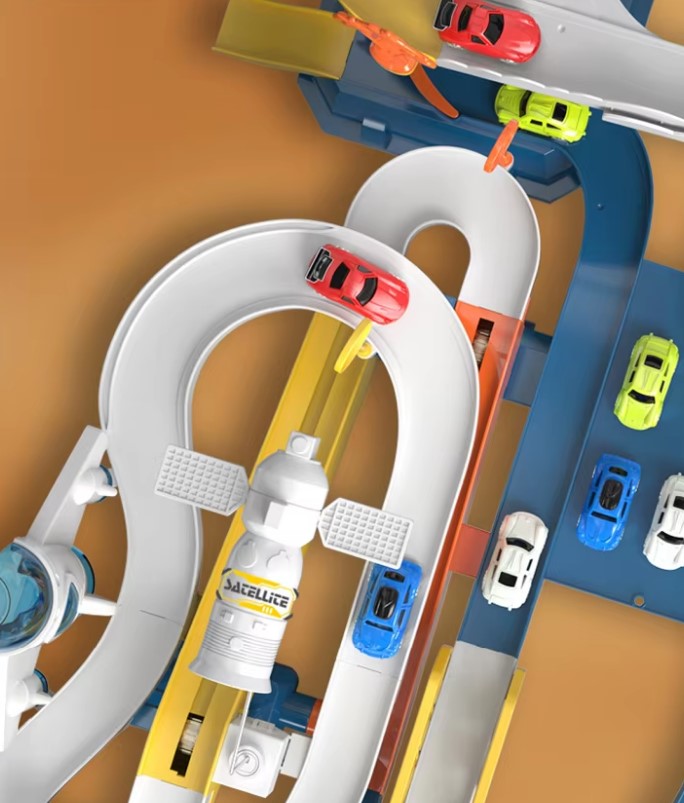 Rampe și piste – mașinuțele incluse pot fi lansate pe trasee dinamice, cu poduri și zone de parcare.