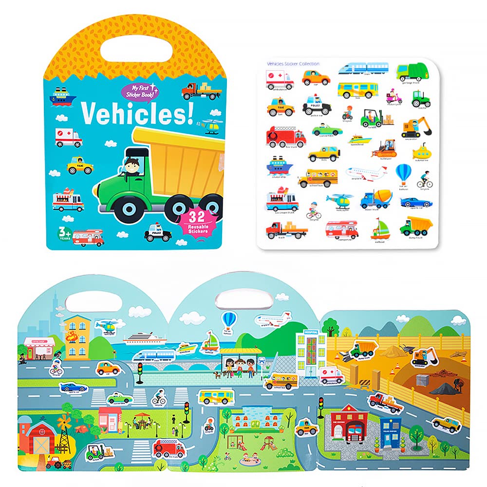 Carte cu 32 stickere reutilizabile – Vehicule, 3 ani+
