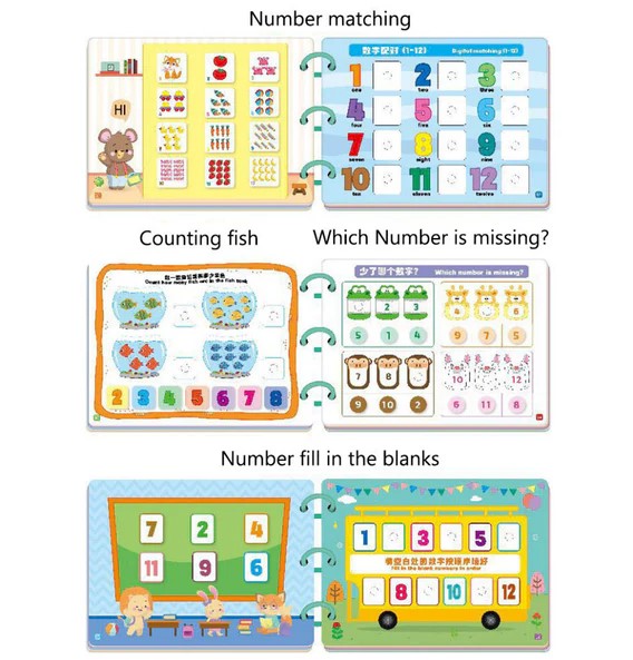 Cartea include multiple activități tematice: recunoașterea cifrelor, potrivirea numerelor, asocierea cu cantități, completarea secvențelor, exerciții de adunare și scădere, ceasul și comparațiile de mărime.