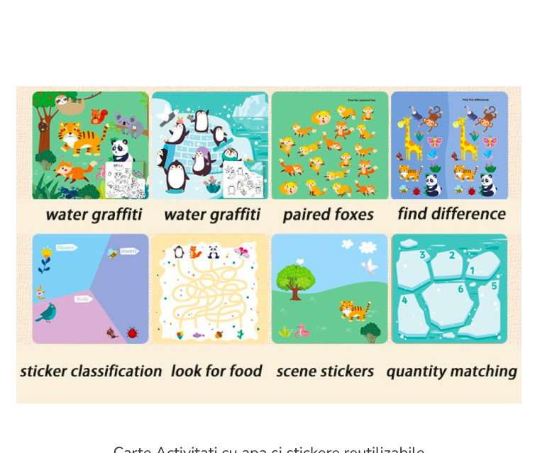 - Activități diverse: Include pagini pentru colorat cu apă, jocuri de tip labirint, identificare de diferențe, clasificare de obiecte și multe altele.