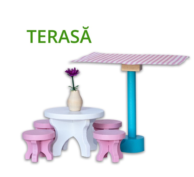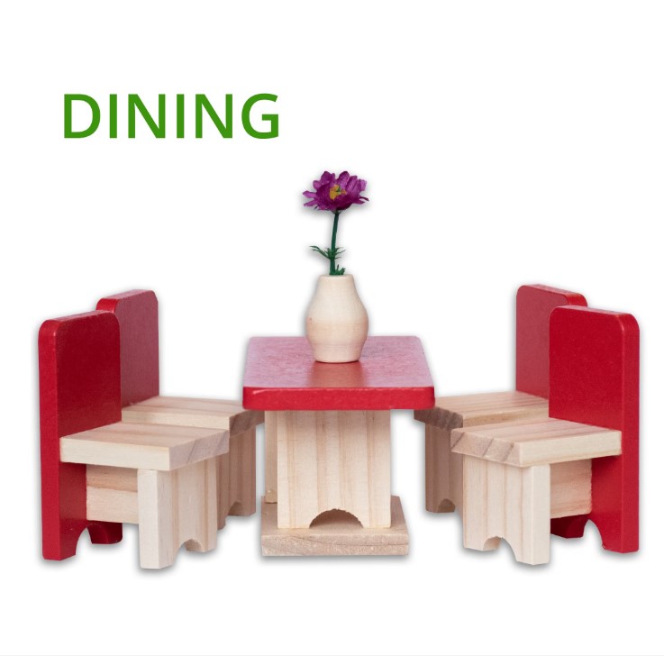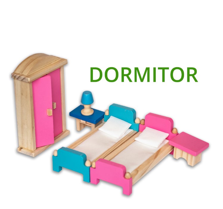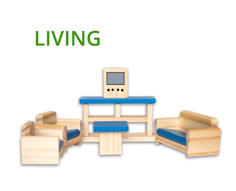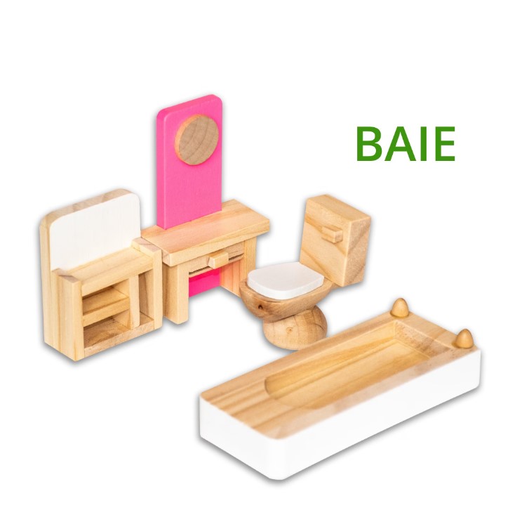 Setul este complet utilat și mobilat, incluzând 32 de accesorii din lemn: pat, dulap, scaune, canapele, masă, bibliotecă, cadă, chiuvetă, toaletă, obiecte decorative și multe altele. Mobilierul este realizat la scară potrivită pentru păpuși mici, ușor de manevrat de către copii.