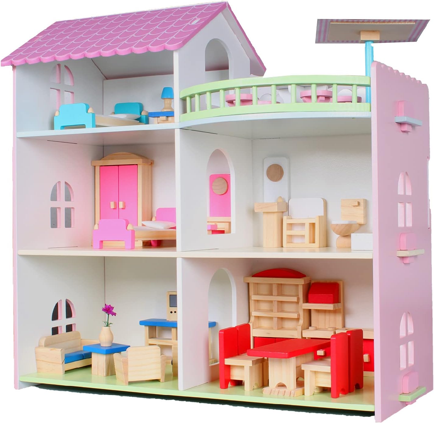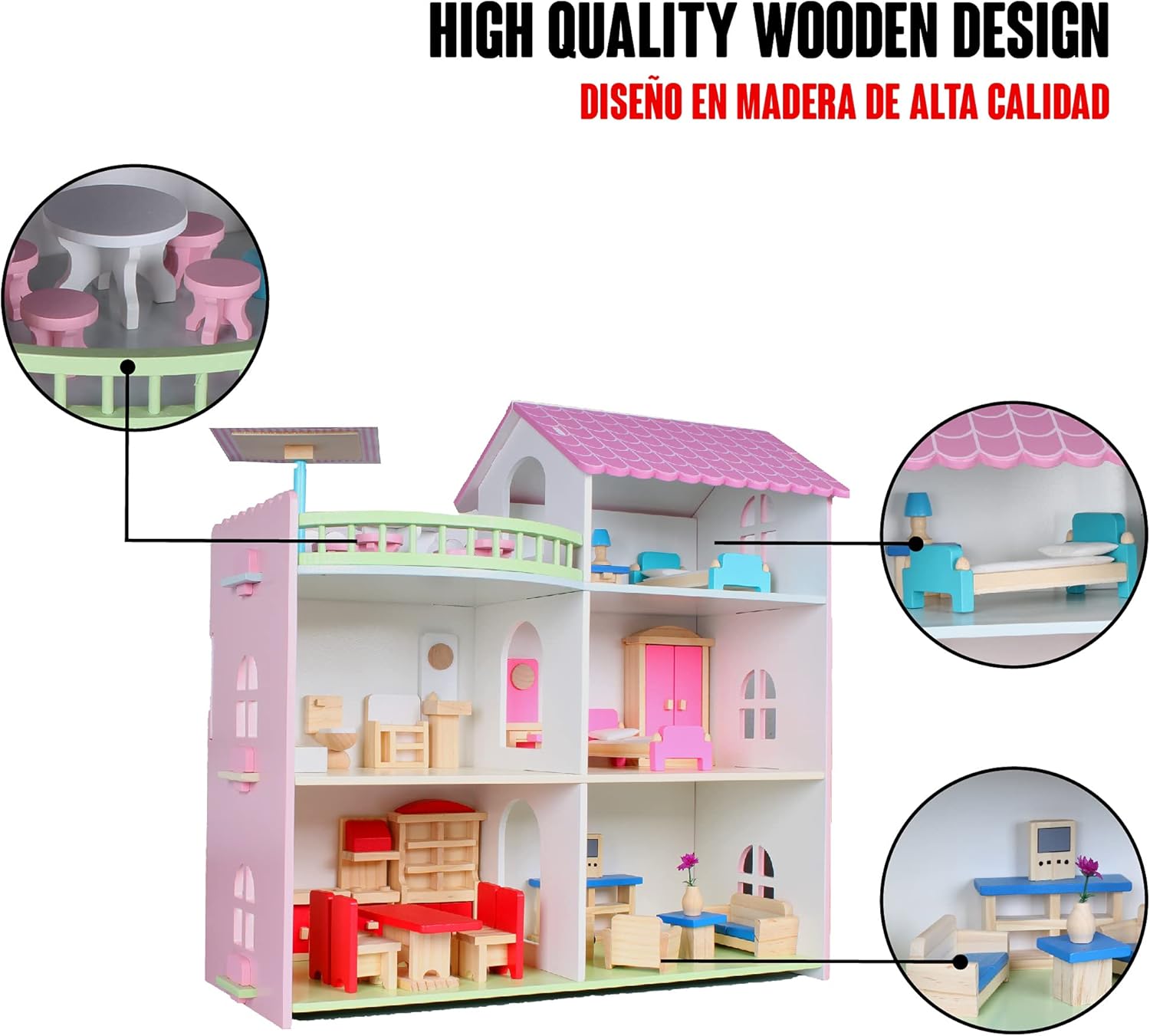 Această casă de păpuși din lemn, cu o înălțime de 46 cm, este alegerea perfectă pentru micuții care adoră jocurile de rol și poveștile de familie. Construită din lemn rezistent și finisată cu atenție, casa are 3 etaje spațioase, balcon și camere decorate cu detalii atractive.