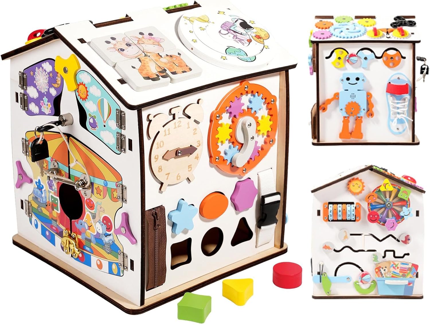 Această căsuță senzorială Montessori este un centru complet de activități pentru dezvoltarea abilităților motrice fine și cognitive ale copiilor cu vârsta de 3 ani și peste. Cu un design interactiv și distractiv, fiecare latură a căsuței este echipată cu activități senzoriale variate, perfecte pentru stimularea creativității și învățarea prin joc.