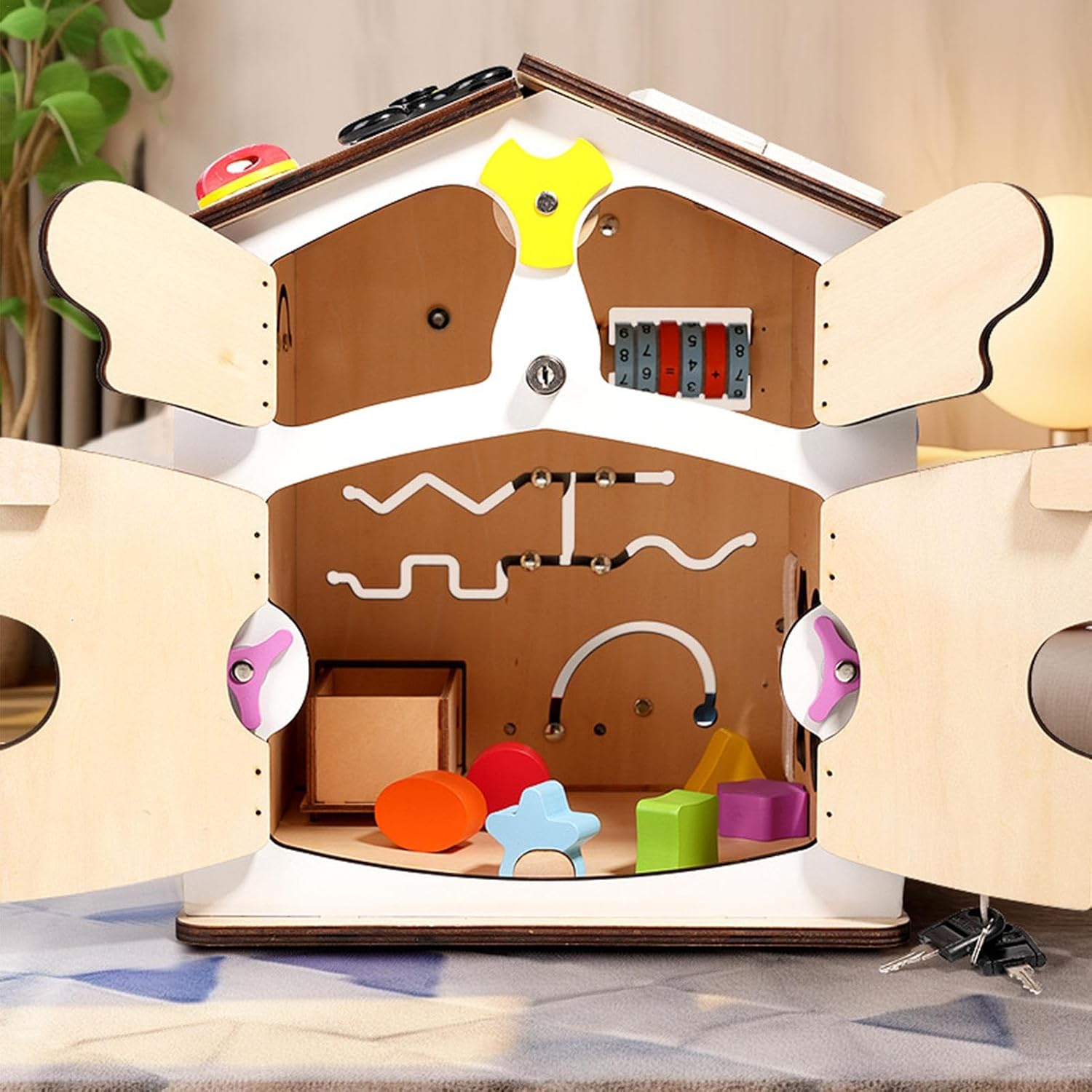 Copiii pot explora căsuța în mod individual, experimentând fiecare activitate și interacționând cu elementele mobile și statice, ceea ce le oferă o experiență educativă completă. Pot deschide și închide ușile, roti roțile zimțate, potrivi formele geometrice sau descifra puzzle-uri mecanice, toate într-un mod sigur și captivant.