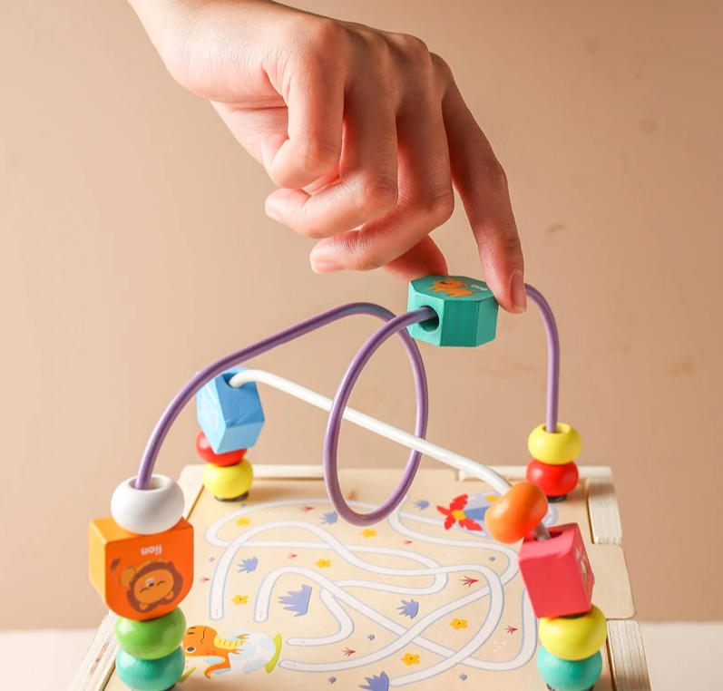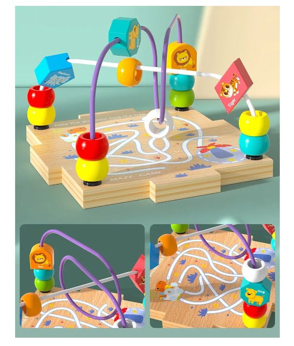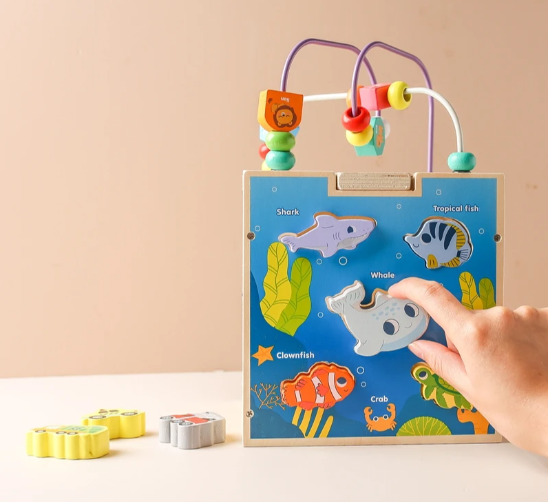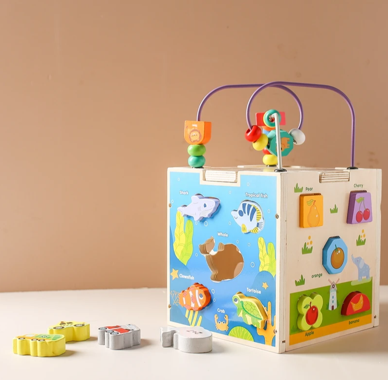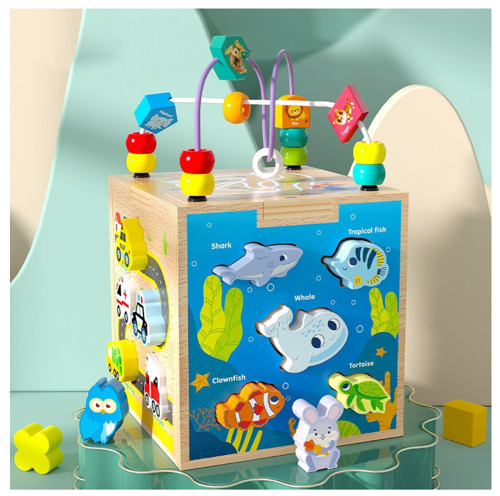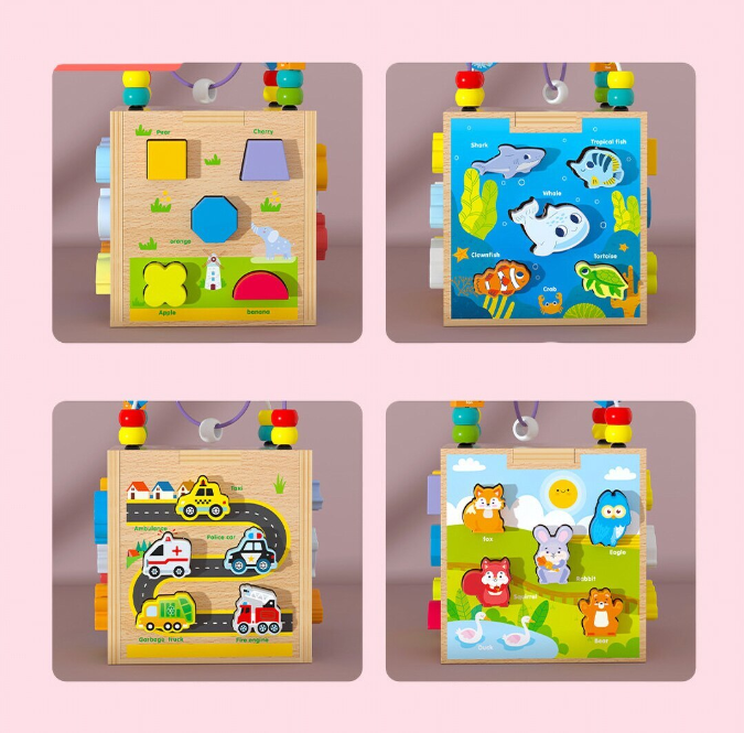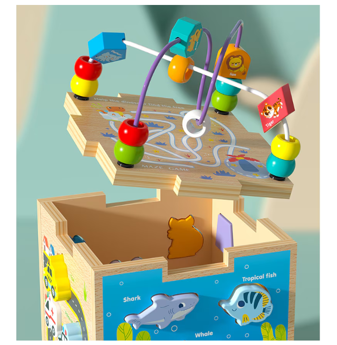Centrul de activități 5 în 1 este o jucărie educativă din lemn, inspirată din metoda Montessori, care le oferă copiilor o experiență de învățare prin joacă variată și interactivă. Fiecare față a cubului include o activitate diferită: labirint cu bile colorate, puzzle cu animale și pești, sortator de forme și fructe, joc cu vehicule, precum și un traseu cu mărgele pe partea superioară.