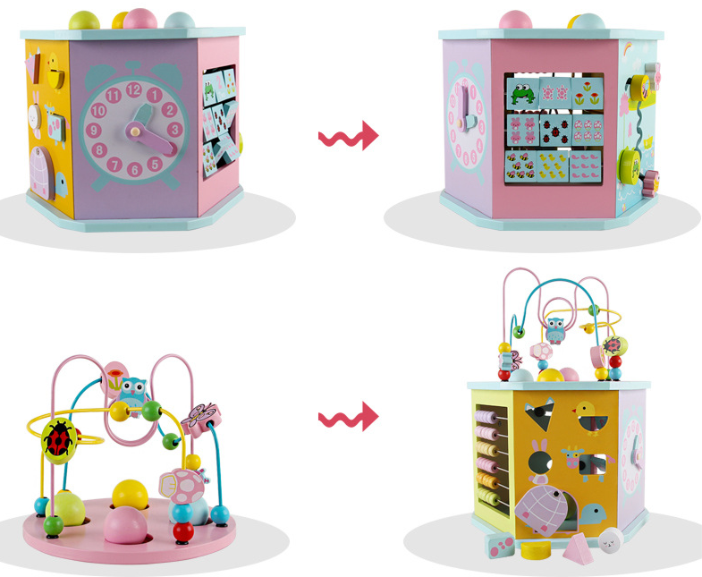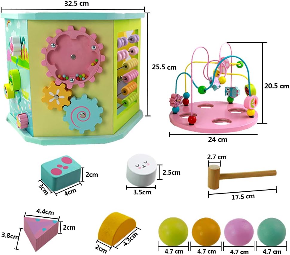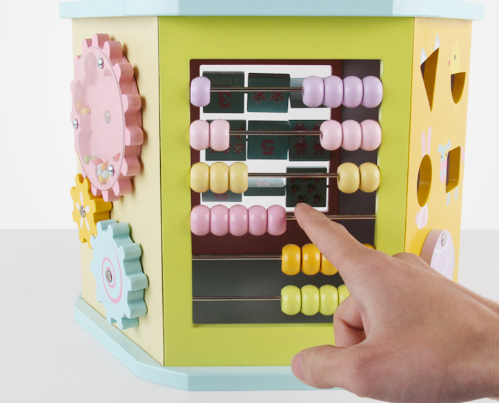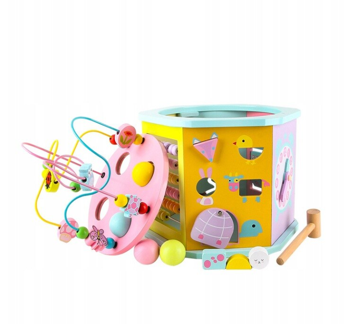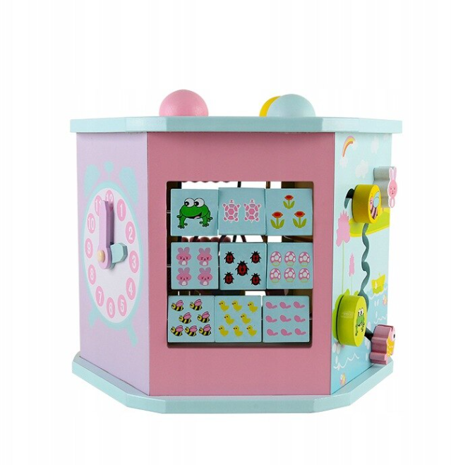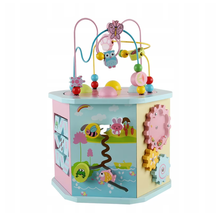 Acest centru de activități este ideal pentru copiii cu vârsta de peste 12 luni, ajutând la dezvoltarea cognitivă, motorie și senzorială prin jocuri care implică recunoașterea formelor, culorilor, numărării și raționamentului logic. Este construit din materiale durabile și sigure pentru copii, având colțuri rotunjite și suprafețe netede pentru a asigura siguranța în timpul jocului.