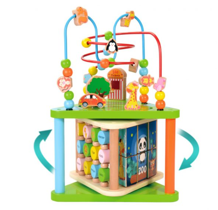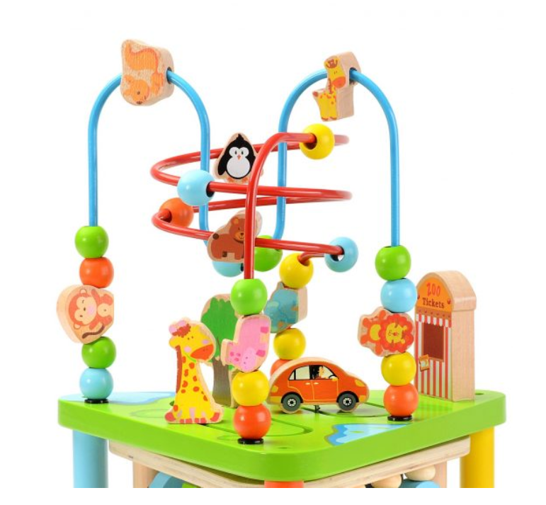 - Design Interactiv: Include un labirint cu bile, puzzle-uri rotative, și blocuri de învățare cu animale și cifre, toate concepute pentru a dezvolta abilitățile motorii fine ale copilului.