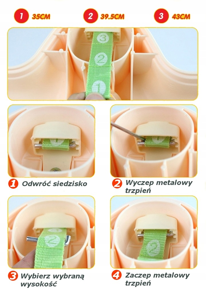 3 niveluri de reglare a înălțimii (35 cm / 39,5 cm / 43 cm) – pentru a crește odată cu bebelușul