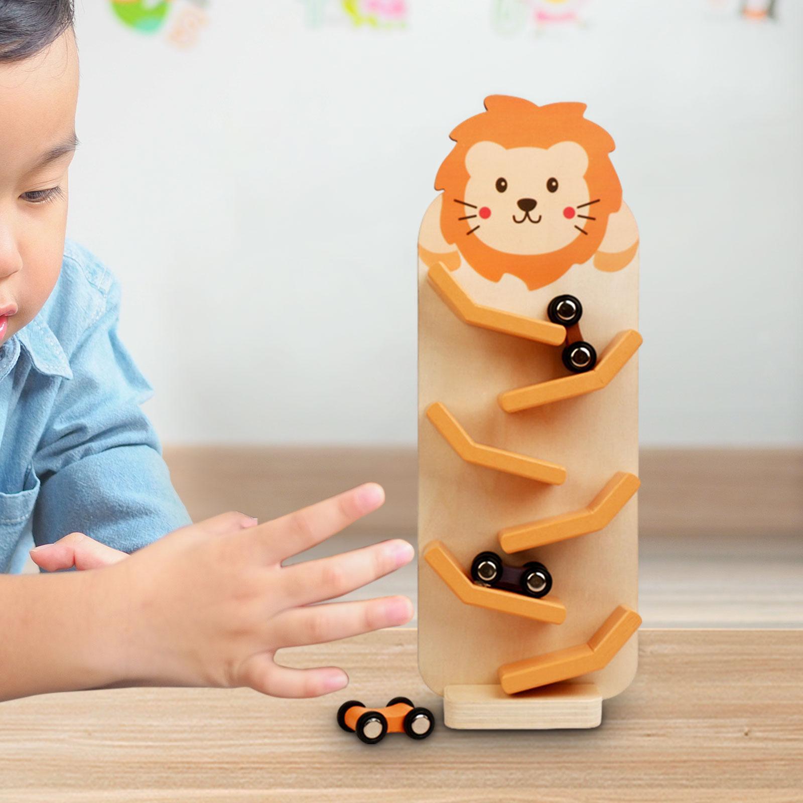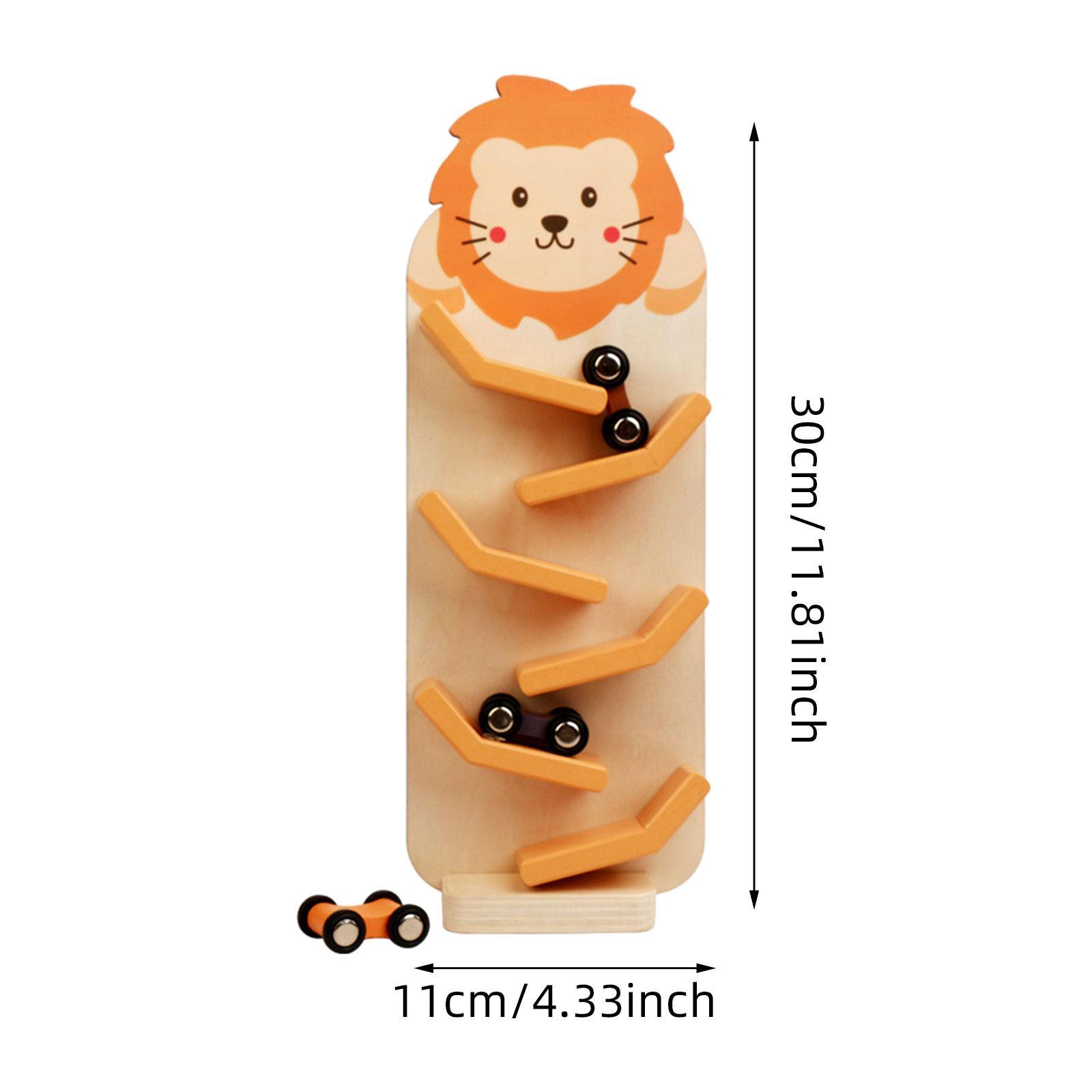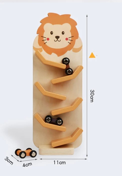 Cu un design prietenos și atractiv, înfățișând un leu vesel, circuitul captează atenția celor mici și îi invită să se joace ore întregi. Mașinuțele din lemn coboară rapid pe traseu, stimulând curiozitatea și oferind o experiență vizuală captivantă.