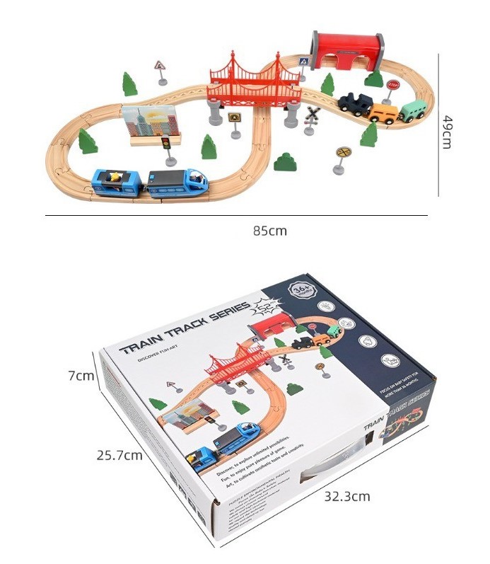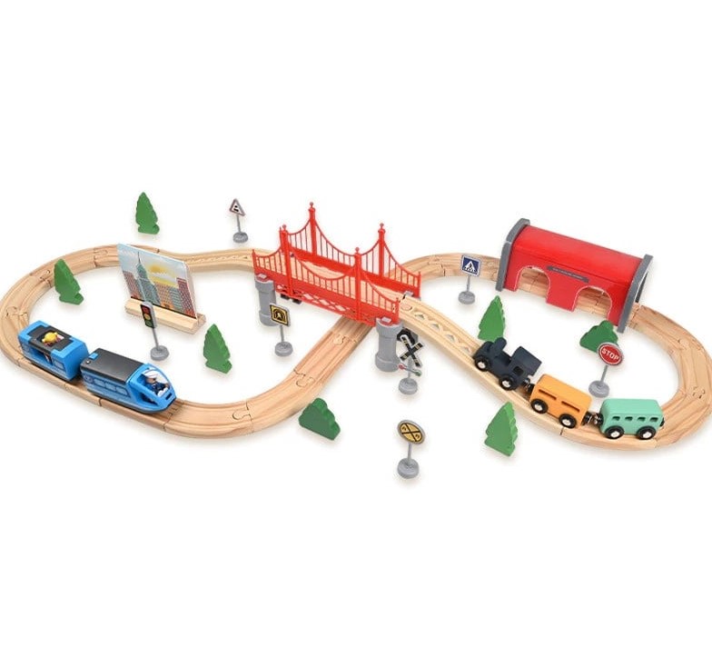 Elemente incluse: șine de lemn, trenulețe cu vagoane magnetice, pod suspendat, tunel, copaci, semne de circulație, clădiri și accesorii