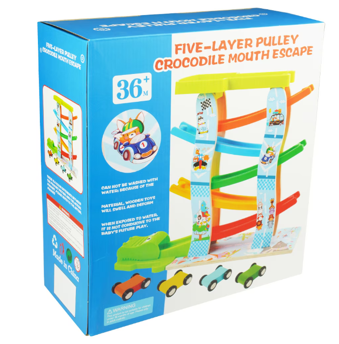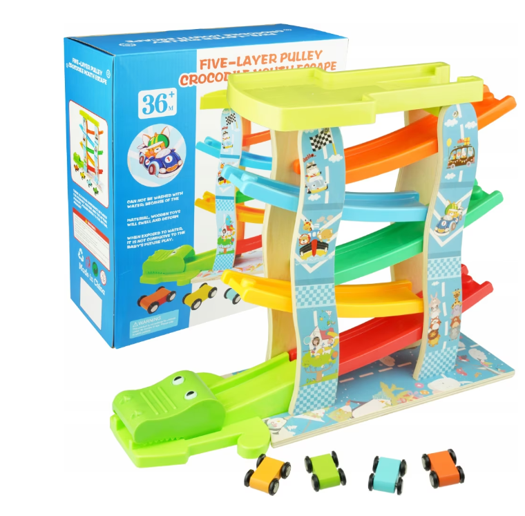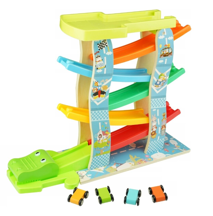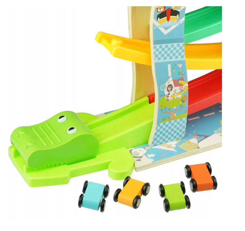 Acest circuit captivant din lemn este perfect pentru micii pasionați de curse! Cu 6 piste suprapuse și 4 mașinuțe colorate, această jucărie oferă ore întregi de distracție și competiție. Mașinuțele din lemn, cu roți silențioase, se întrec pe fiecare nivel al circuitului, alunecând cu viteză, răsturnându-se și învingând obstacolul final — un cap de crocodil verde care adaugă o notă de amuzament în cursă.