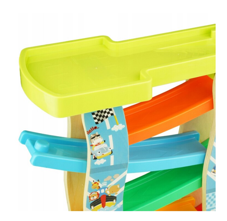 - Design interactiv: Circuitul include 6 piste, oferind posibilitatea unei curse pline de adrenalină pentru cele 4 mașinuțe din lemn.