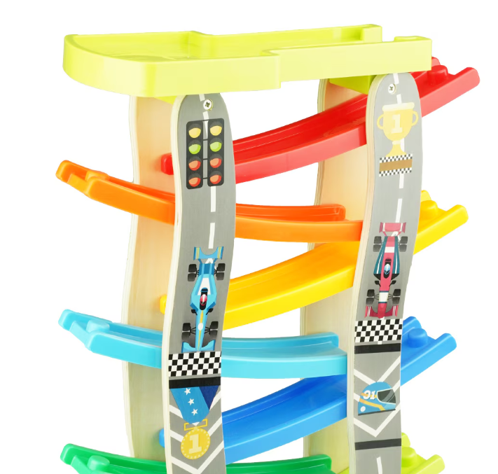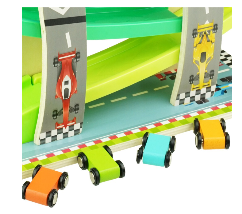 - Design interactiv: Circuitul include 8 piste, oferind posibilitatea unei curse pline de adrenalină pentru cele 4 mașinuțe din lemn.