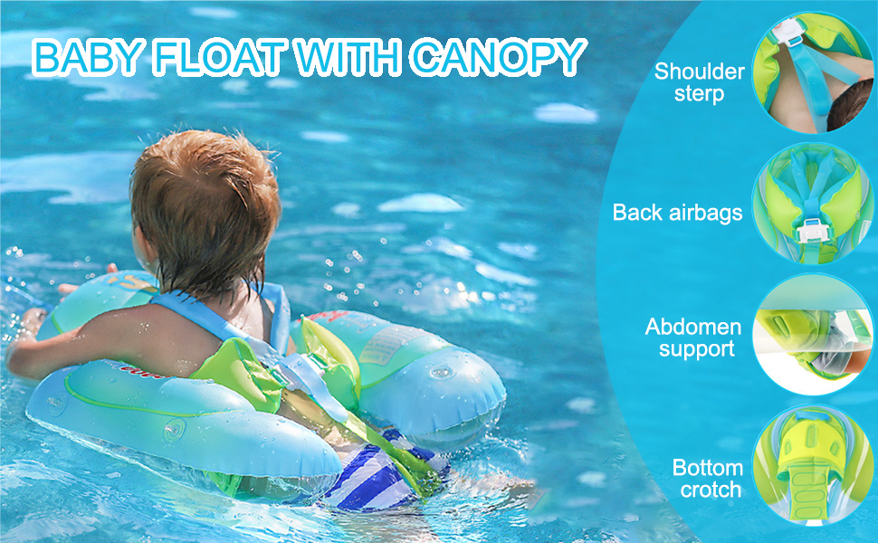 Prevăzut cu centuri reglabile în 5 puncte: bretele pentru umeri, suport lombar, susținere abdominală și chingă între picioare – pentru o fixare optimă și o poziție sigură a copilului în apă. -