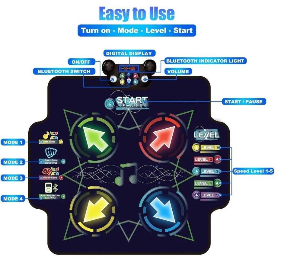 Transformă joaca celor mici într-o experiență distractivă și plină de energie cu acest covoraș muzical interactiv! Dotat cu lumini LED, funcții muzicale și conexiune Bluetooth, covorașul îi invită pe copii să danseze, să se miște și să se bucure de muzică într-un mod activ și sănătos.