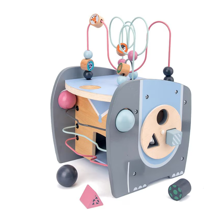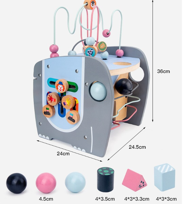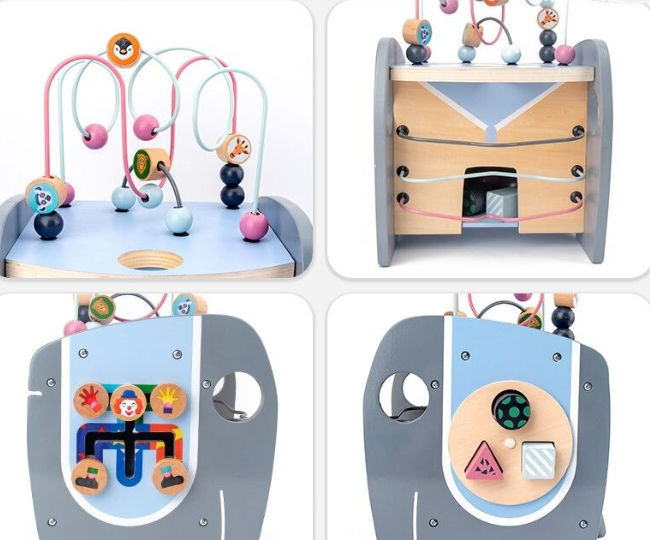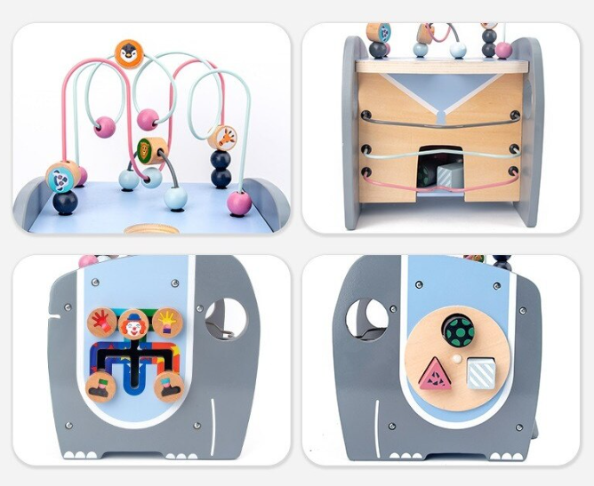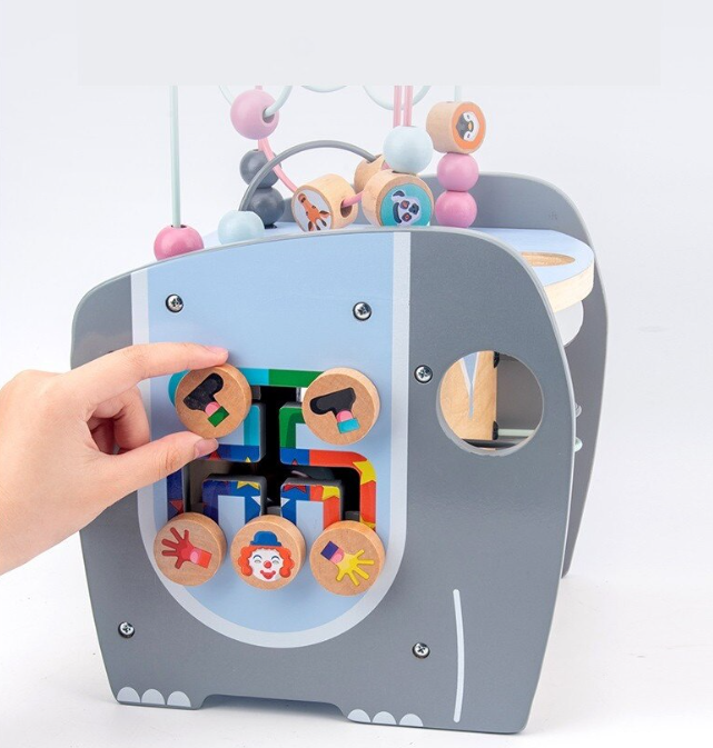 • În partea de sus a cubului interactiv din lemn există un labirint de motricitate cu margele, care poate fi îndepărtat și folosit separat.