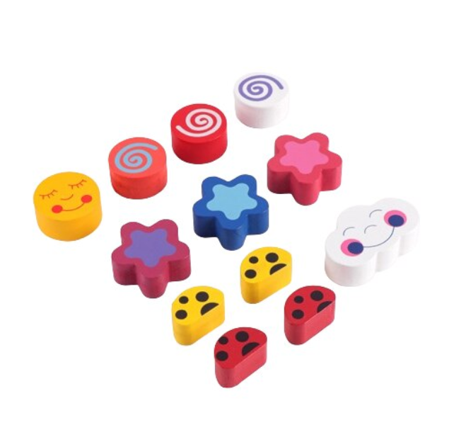 - Forme geometrice: Include diverse forme precum fluturași, melci, soare, și norișori, toate viu colorate și ușor de manevrat.
