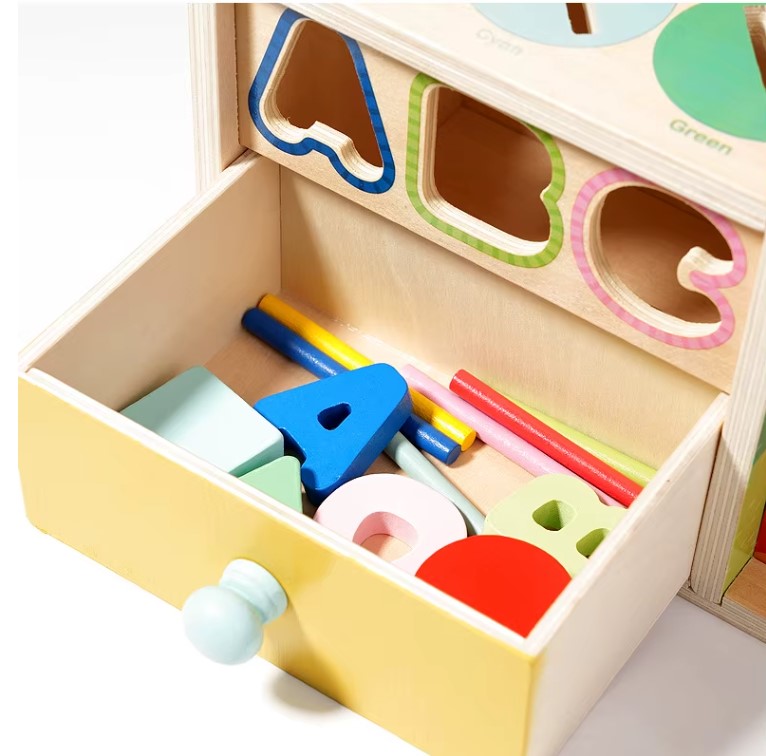 Cutia permanenței – joc educativ multifuncțional din lemn, sortare forme, litere, culori, sunet