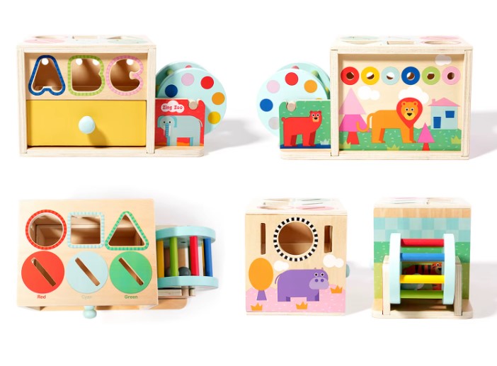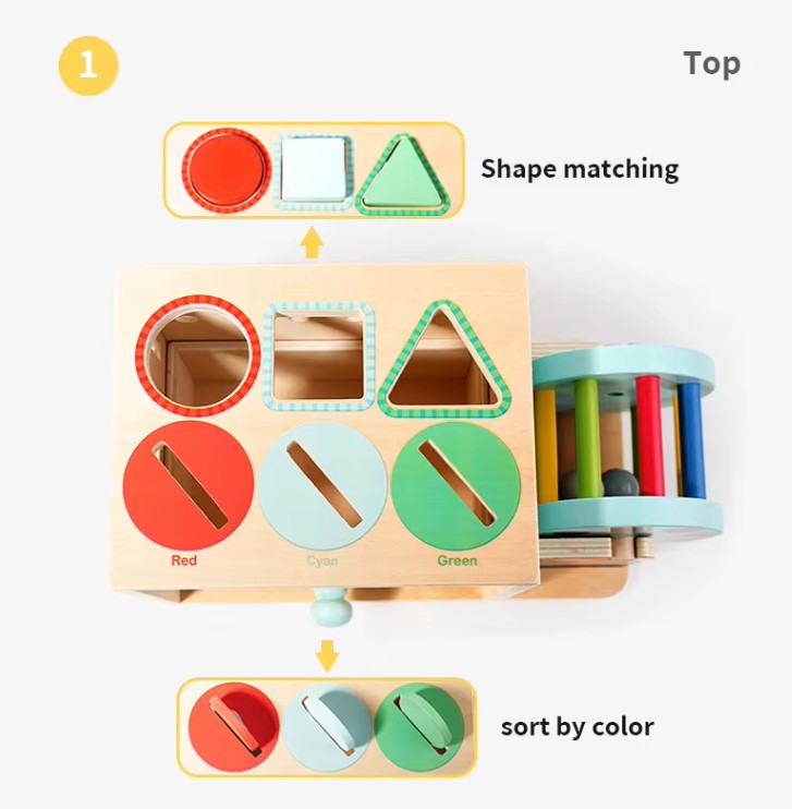 ✔️ Abilități motrice: tragerea sertarului, manipularea pieselor și potrivirea lor dezvoltă dexteritatea