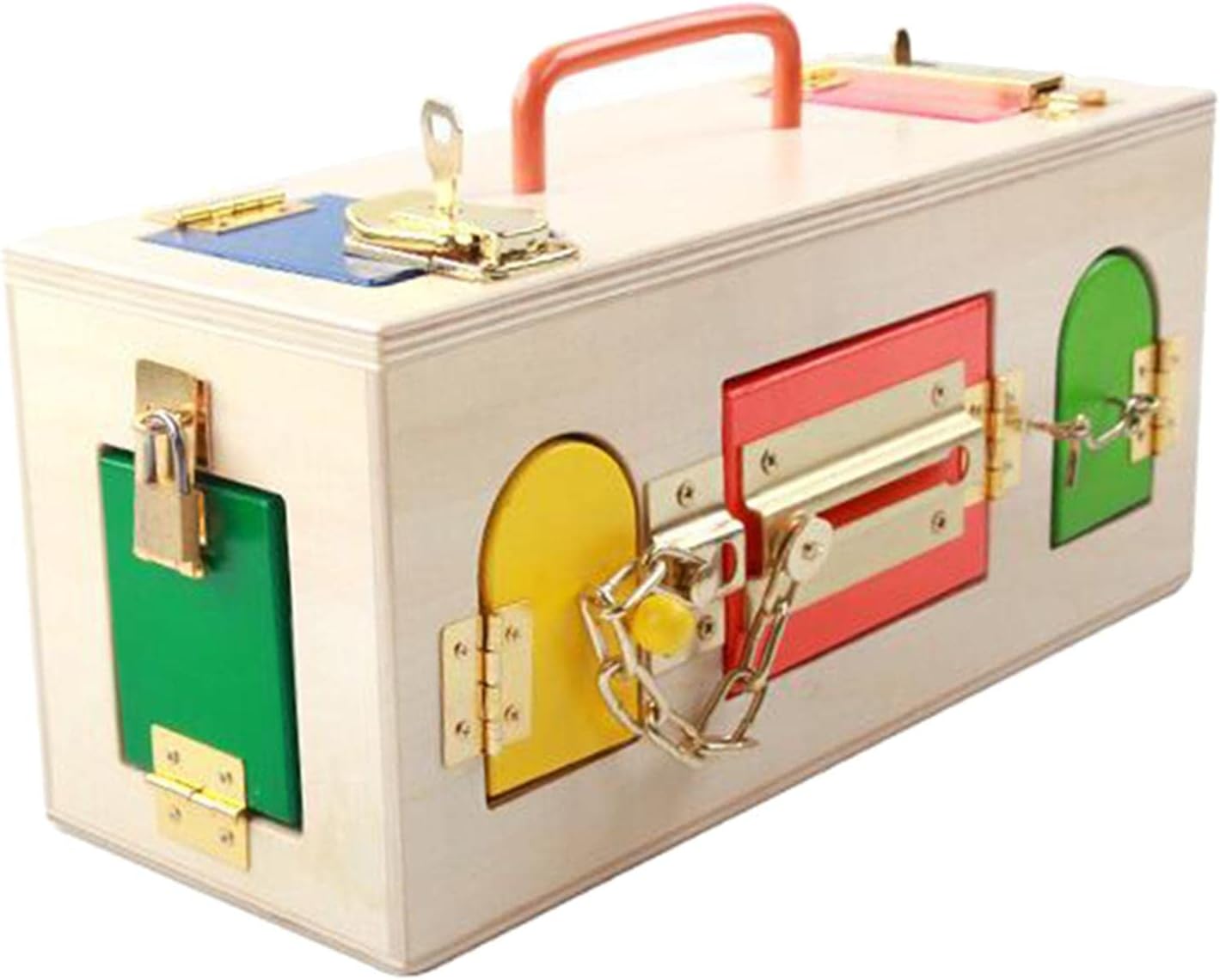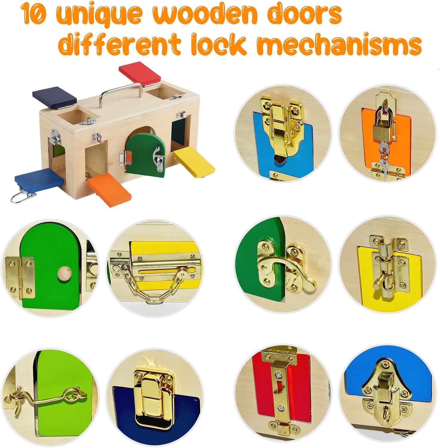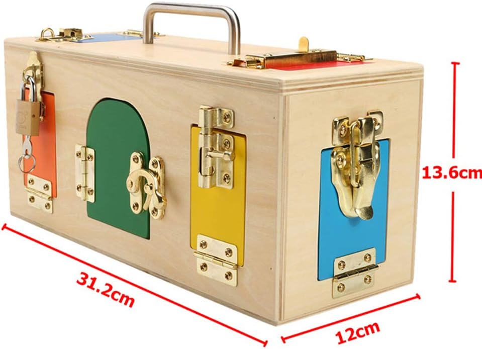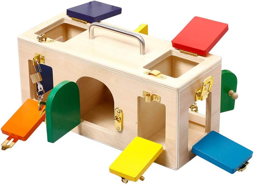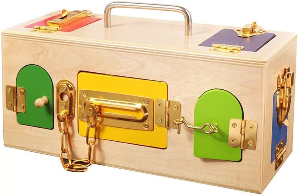 Cutia Montessori cu încuietori este o jucărie educativă din lemn, concepută pentru dezvoltarea motricității fine, a răbdării și a abilităților practice ale copiilor. Realizată din lemn masiv, finisat cu muchii rotunjite și vopsele non-toxice, cutia include 10 uși și ferestre colorate, fiecare prevăzută cu un tip diferit de mecanism de închidere – lacăt cu cheie, zăvor, lanț, cârlig, cataramă sau broască.