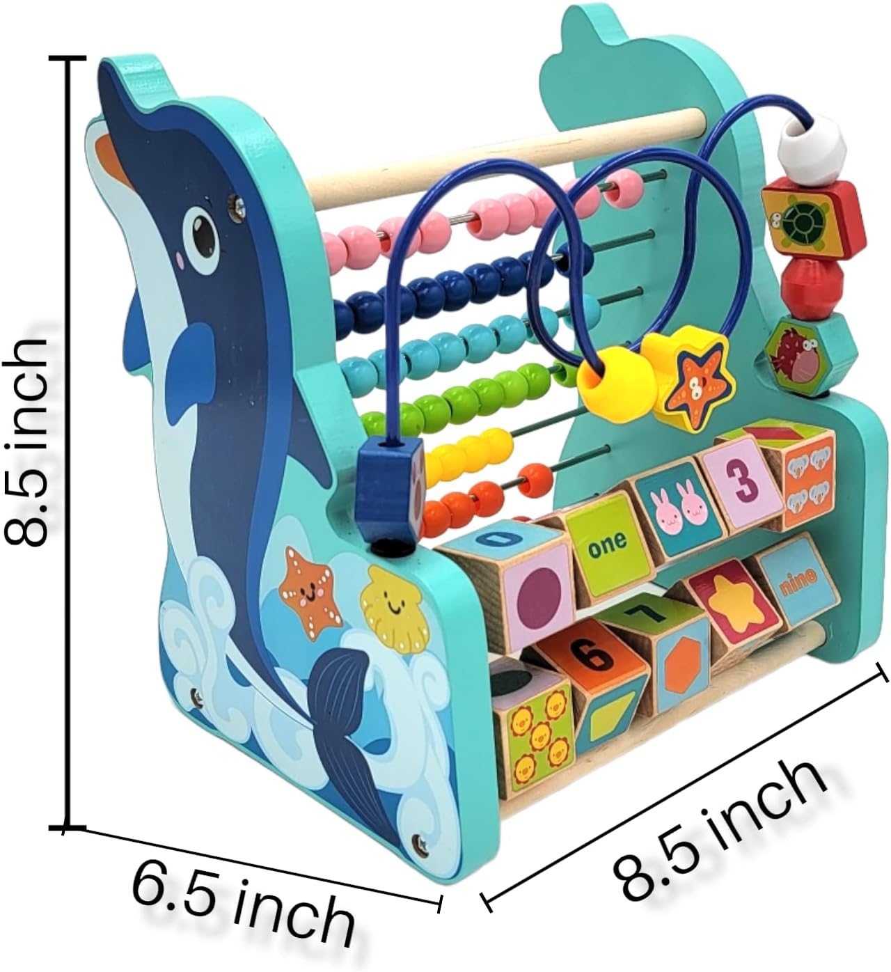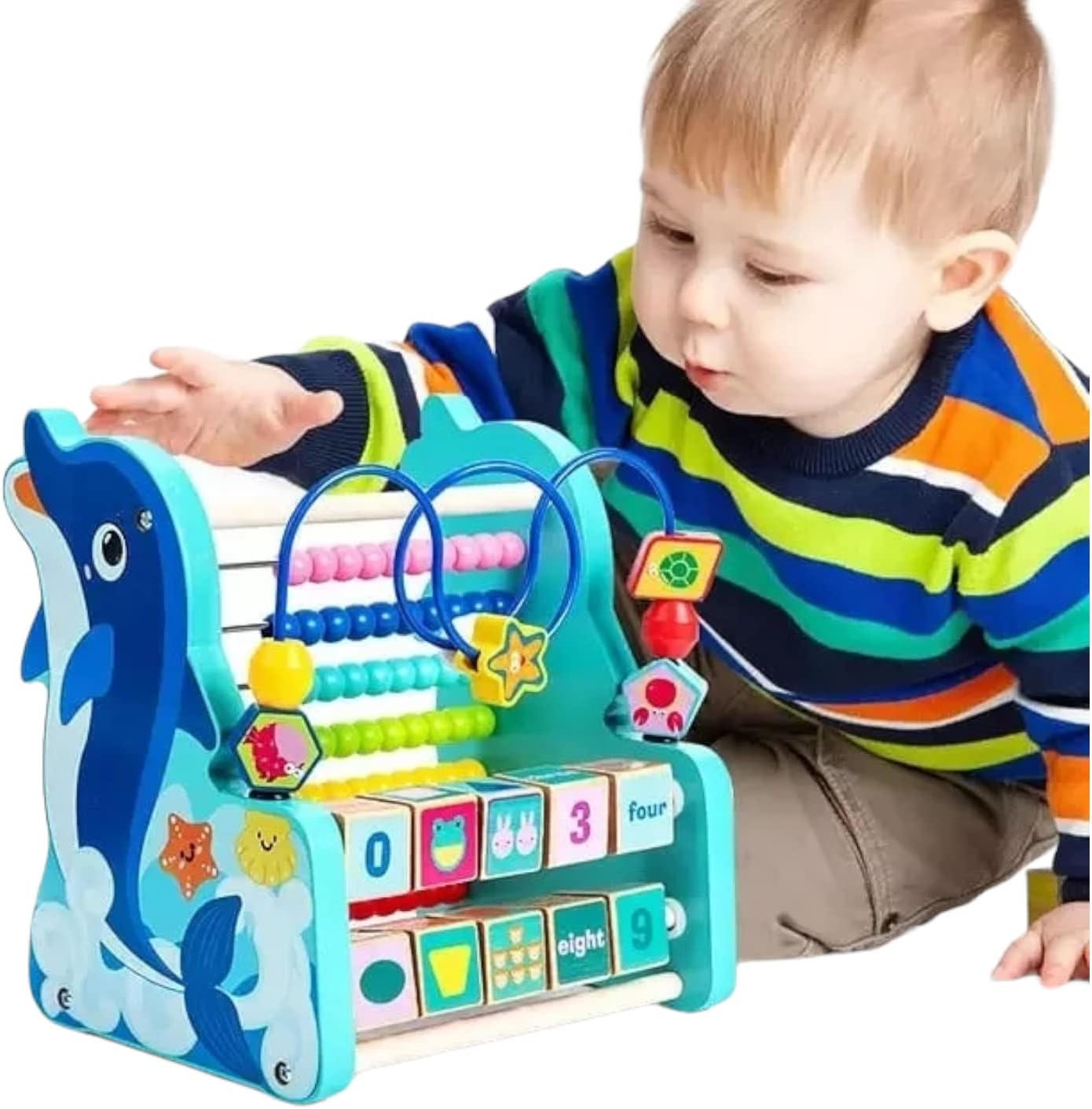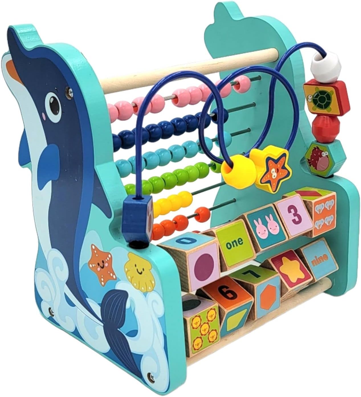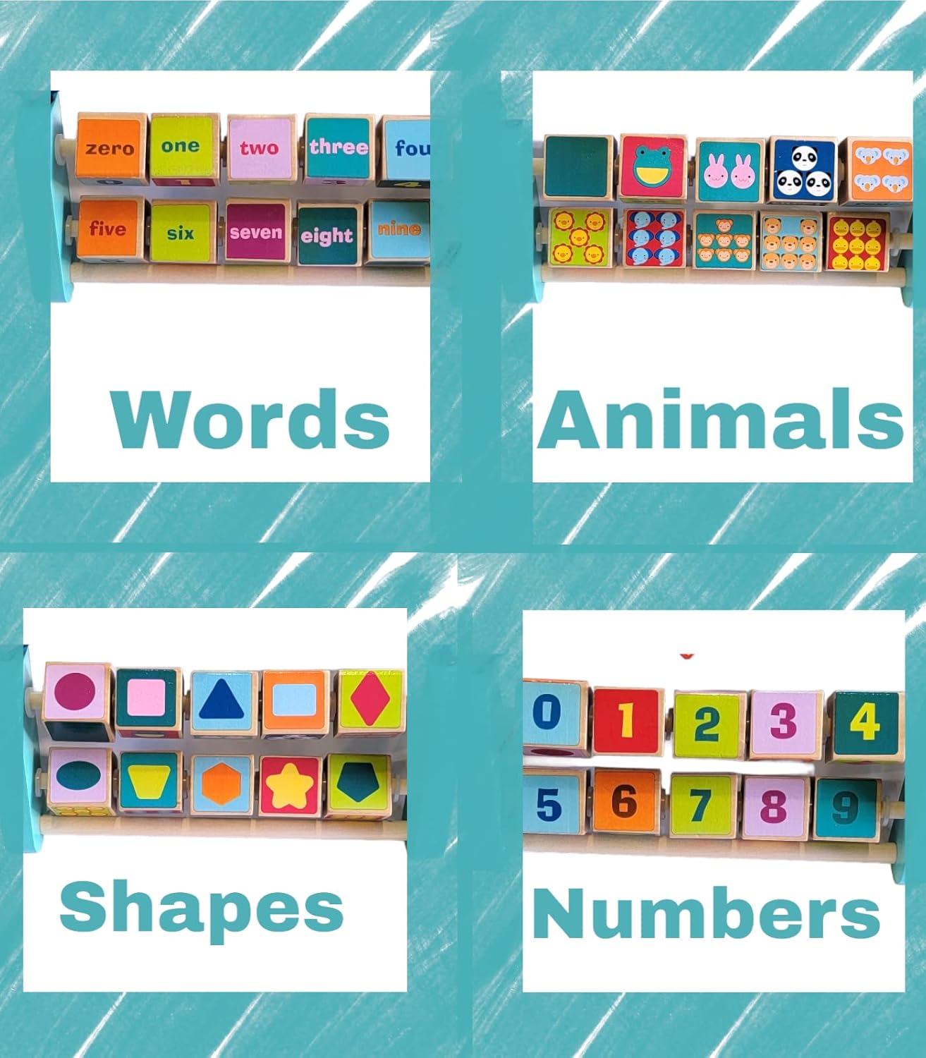 Jucaria educativa din lemn contine un abac cu bile colorate in partea din fata, partile laterale sunt in forma de girafa, iar in partea din spate este un circuit cu bile tip labirint Montessori pentru dezvoltarea motricitatii fine, si o jucarie tip puzzle rotativ cu cuburi ce prin rotire afiseaza cifre, imagini.