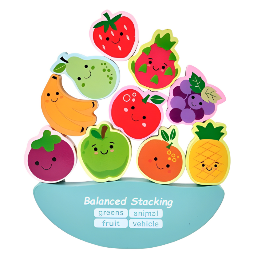 - Joc de echilibru: Copiii trebuie să așeze fructele pe baza balansabilă, încercând să mențină echilibrul. Aceasta activitate ajută la dezvoltarea simțului de echilibru și a răbdării.