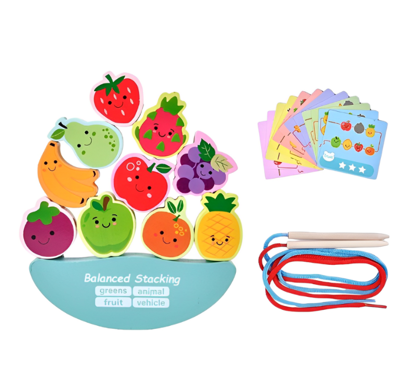 Acest joc educativ 3 în 1 pentru copii de 3 ani combină trei activități esențiale pentru dezvoltarea cognitivă și motorie a celor mici: logica, echilibrul și snuruitul. Setul include fructe viu colorate, o bază de echilibru, sfori pentru snuruit și cartonașe pentru asocieri logice, oferind o experiență interactivă și versatilă. Fructele pot fi folosite în diferite moduri: pentru a fi snuruite, echilibrate pe baza specială și asociate cu imagini, toate având scopul de a stimula creativitatea, logica și coordonarea mână-ochi.