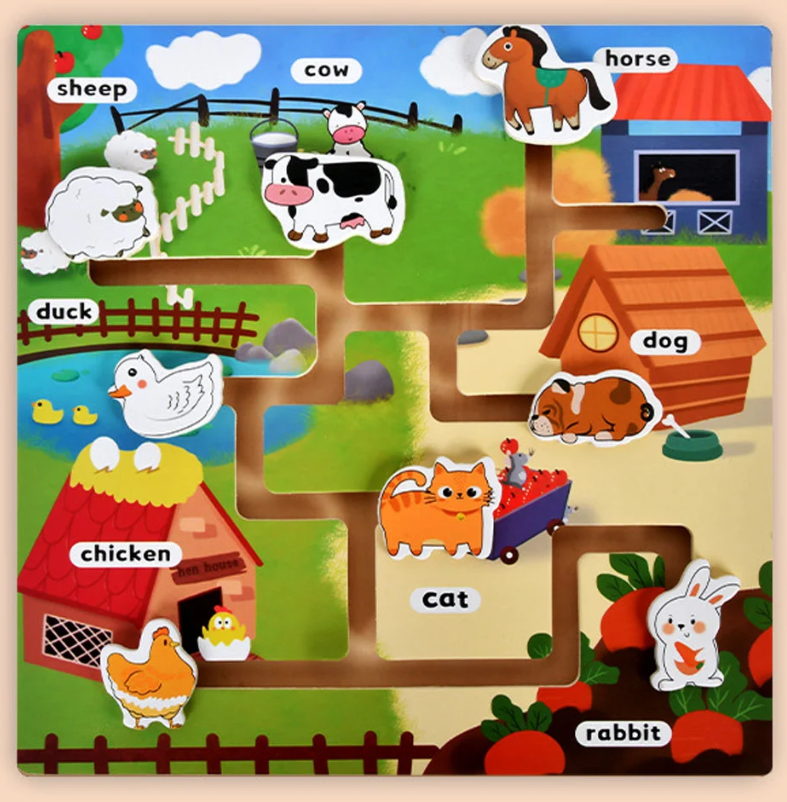 Joc din lemn de tip Montessori, joc pentru invatarea animalelor de la ferma, ce dezvolta indemanarea, dexteritatea, asocierea si rabdarea copiilor.