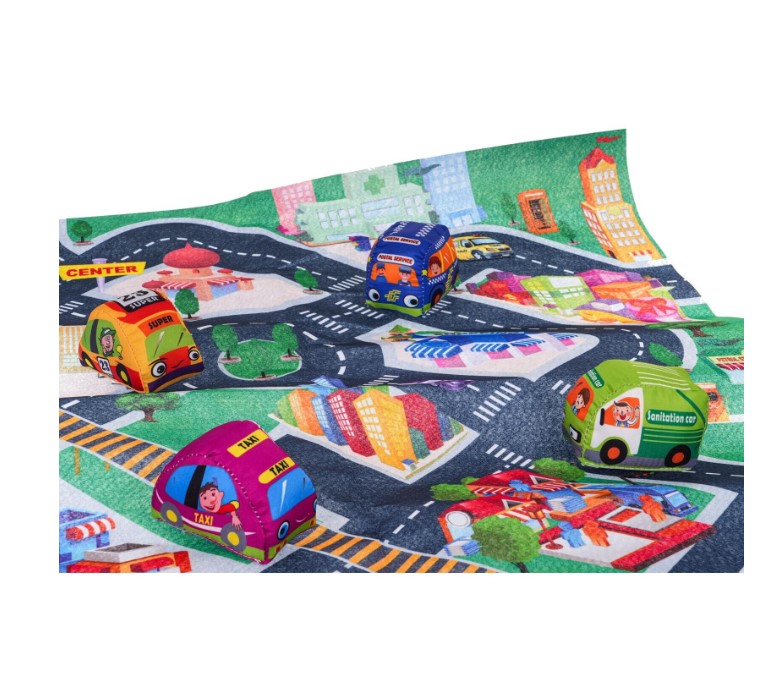 Un set de joacă ideal pentru bebelușii de peste 6 luni, care îmbină joaca senzorială cu explorarea orașului în miniatură! Acest joc conține 4 mașinuțe textile moi, ușor de apucat de către mânuțele mici, și un covoraș de joacă viu colorat, imprimat cu drumuri, clădiri și elemente urbane care stimulează curiozitatea și dezvoltarea vocabularului.