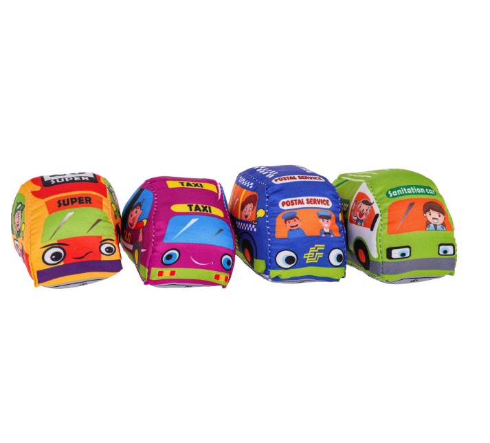 Setul include 4 mașinuțe din material textil (taxi, poștă, sanitație, autobuz), cu imprimeuri haioase și prietenoase.