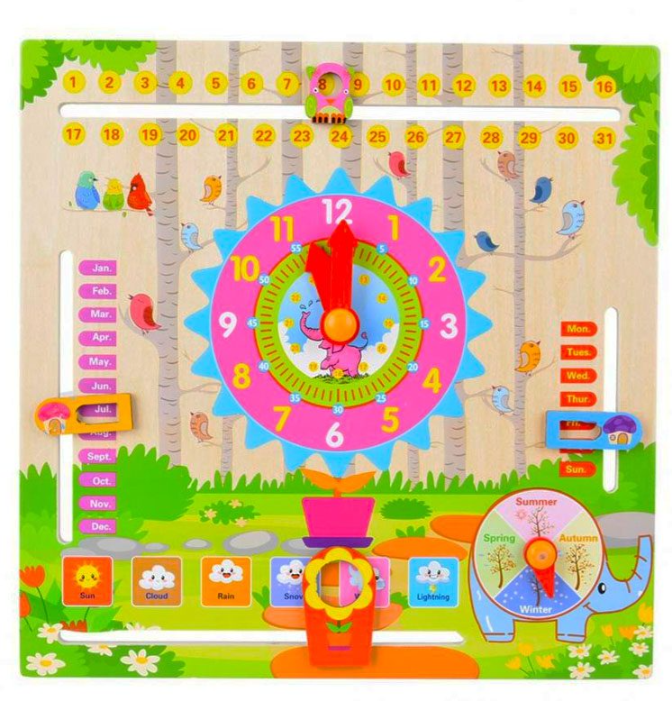 - Anotimpuri și vreme: Copilul poate roti discul anotimpurilor pentru a reflecta anotimpul curent și poate folosi alte indicatoare pentru a arăta cum este vremea afară.