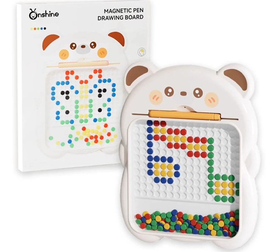 Mozaicul Pixel Magnetic este o tablă interactivă sub formă de ursuleț, echipată cu bile magnetice colorate (roșu, galben, albastru, verde, negru) și un creion magnetic care permite „desenarea” mozaicurilor prin ridicarea bilelor din bază în locurile indicate. Copilul urmează modelele de pe fișele incluse sau creează propriile opere de artă, fără murdărie, lipici sau piese greu de adunat.