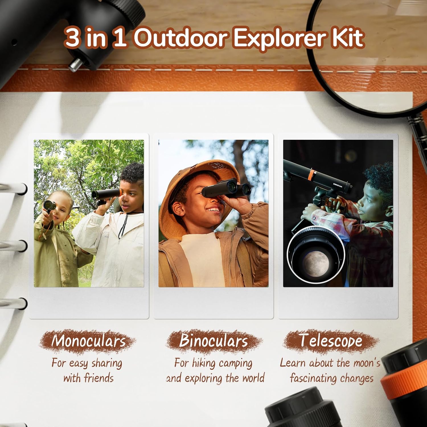 Acest set educativ 2 în 1 este ideal pentru micii exploratori curioși să descopere tainele științei și ale naturii. Combinația dintre microscop și binoclu îi ajută pe copii să observe atât lumea microscopică, cât și peisajele îndepărtate, animalele sau cerul înstelat.