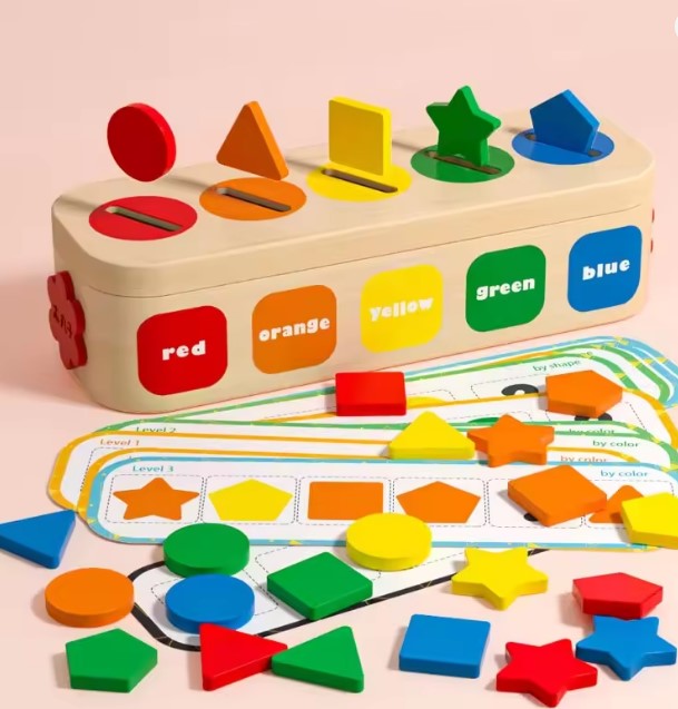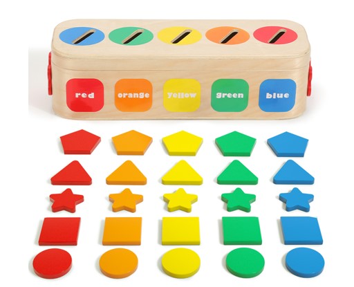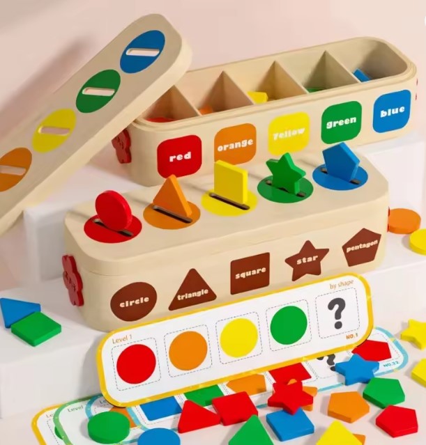 Acest joc educativ din lemn este ideal pentru copiii de la 3 ani, ajutându-i să învețe într-un mod distractiv culorile și formele geometrice. Setul conține o cutie de sortare cu fante corespunzătoare și un set de cartonașe cu exerciții care ghidează copilul în activități de asociere și clasificare.