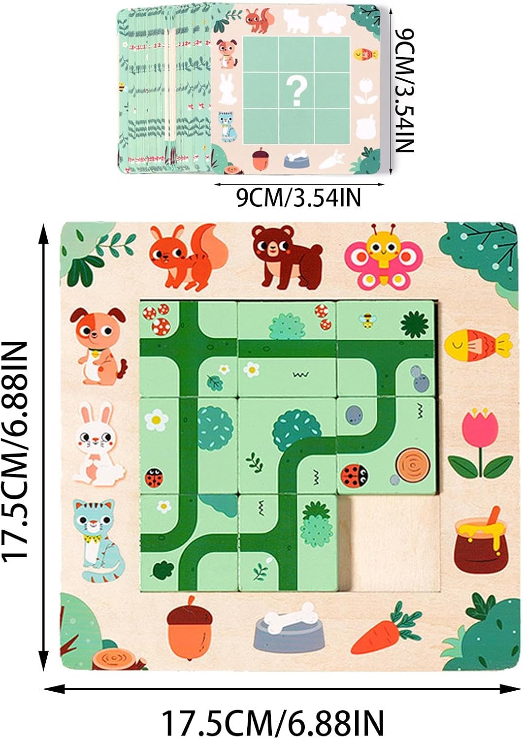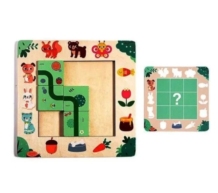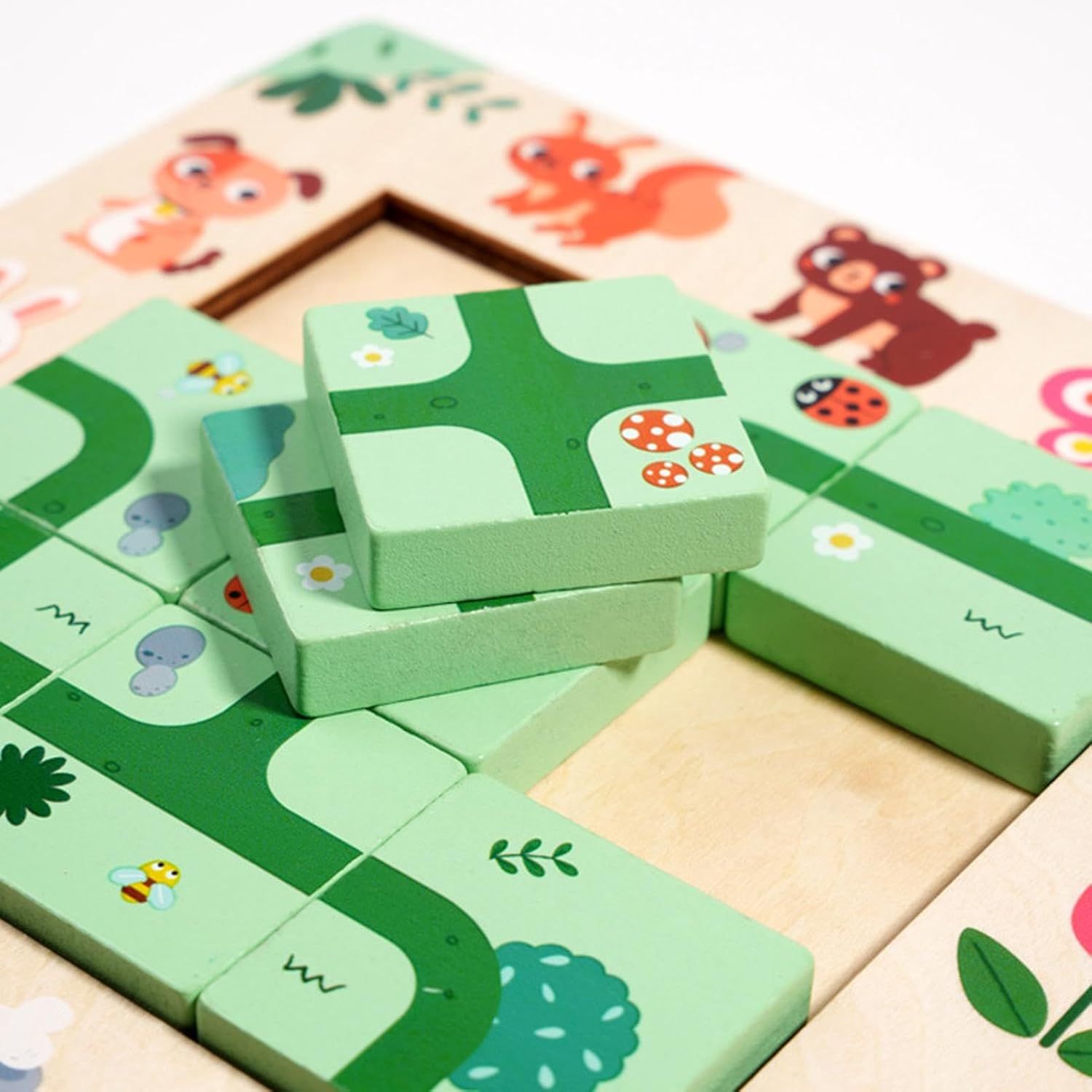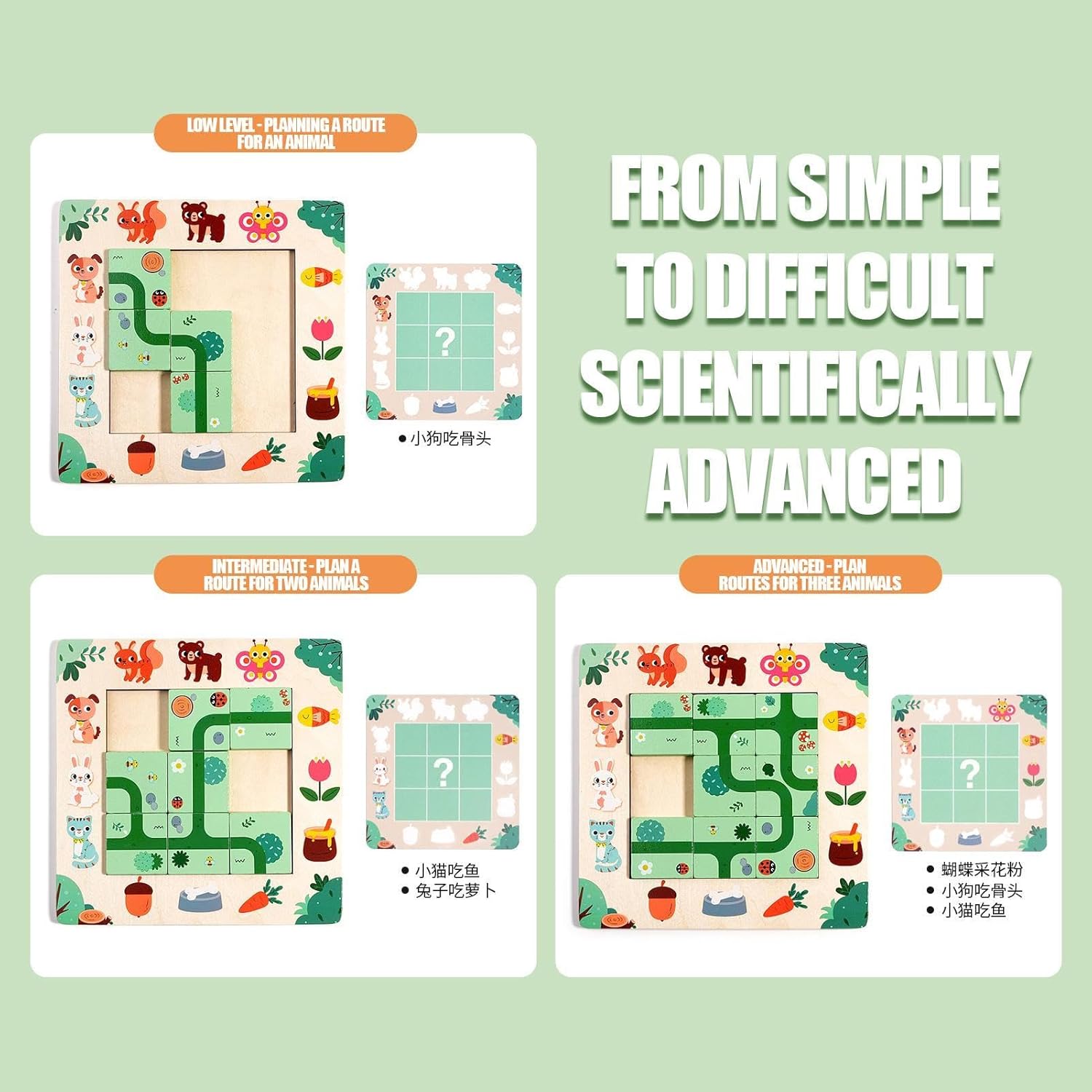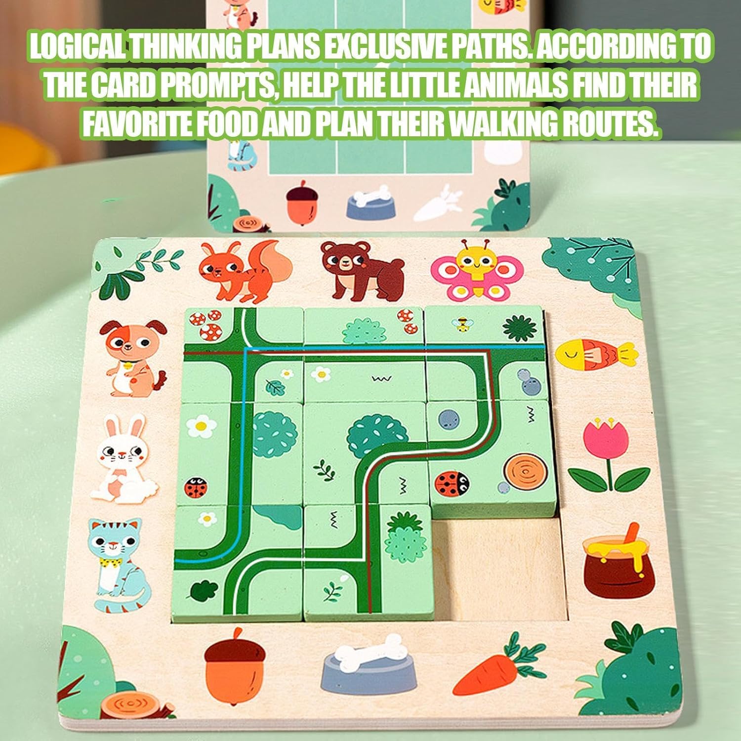 Acest puzzle educativ tip wayfinding este o jucărie inteligentă care le oferă copiilor ocazia să învețe planificarea traseului și gândirea logică într-un mod distractiv și interactiv. Conține o tablă ilustrată și un set de piese pătrate cu trasee, pe care copilul le va așeza astfel încât animăluțele să ajungă la mâncarea preferată.