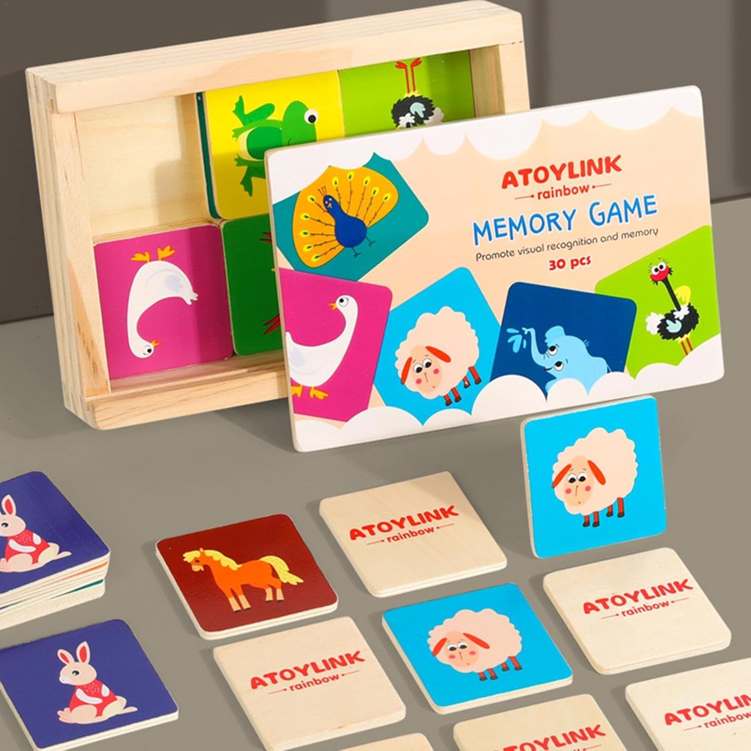 Jocul de memorie din lemn cu animale este o jucărie educativă menită să îmbunătățească concentrarea, recunoașterea vizuală și memoria celor mici. Setul conține 30 de piese ilustrate cu animale viu colorate, fiecare având un corespondent pereche. Aceste piese sunt realizate din lemn de calitate superioară, cu margini netede și rotunjite pentru siguranța copiilor.
