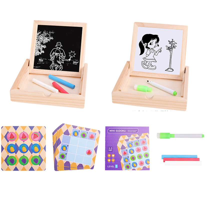 - Creativitate: Partea de desen de pe tabla de lemn permite copilului să-și exprime creativitatea prin desen sau scris.