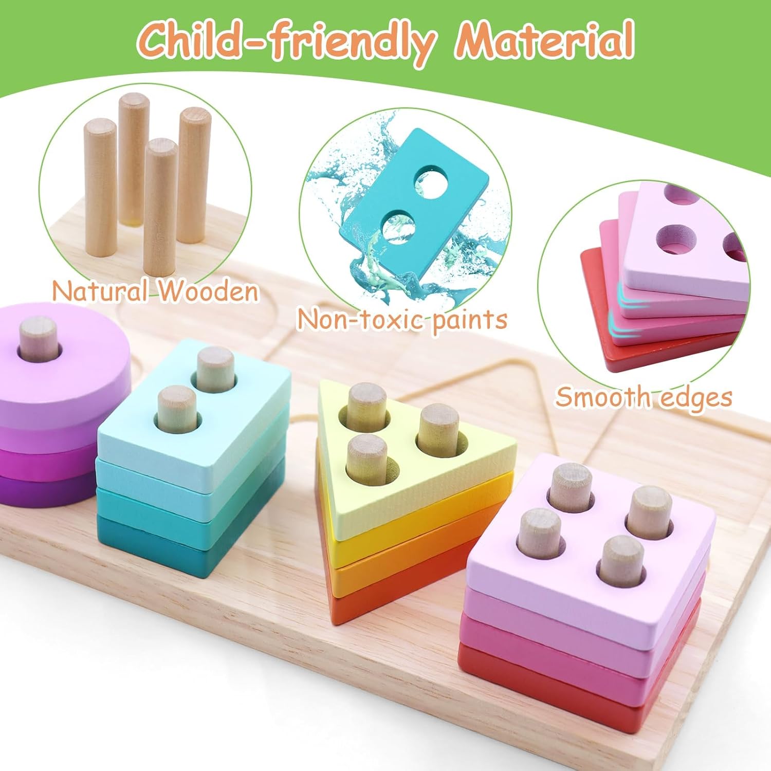 Jocul de sortare 3 în 1 este un set educativ multifuncțional care ajută copiii să învețe formele, culorile și principiile de bază ale organizării prin joc. Acesta este realizat din lemn natural și vopseluri non-toxice, având colțuri rotunjite pentru siguranța celor mici.