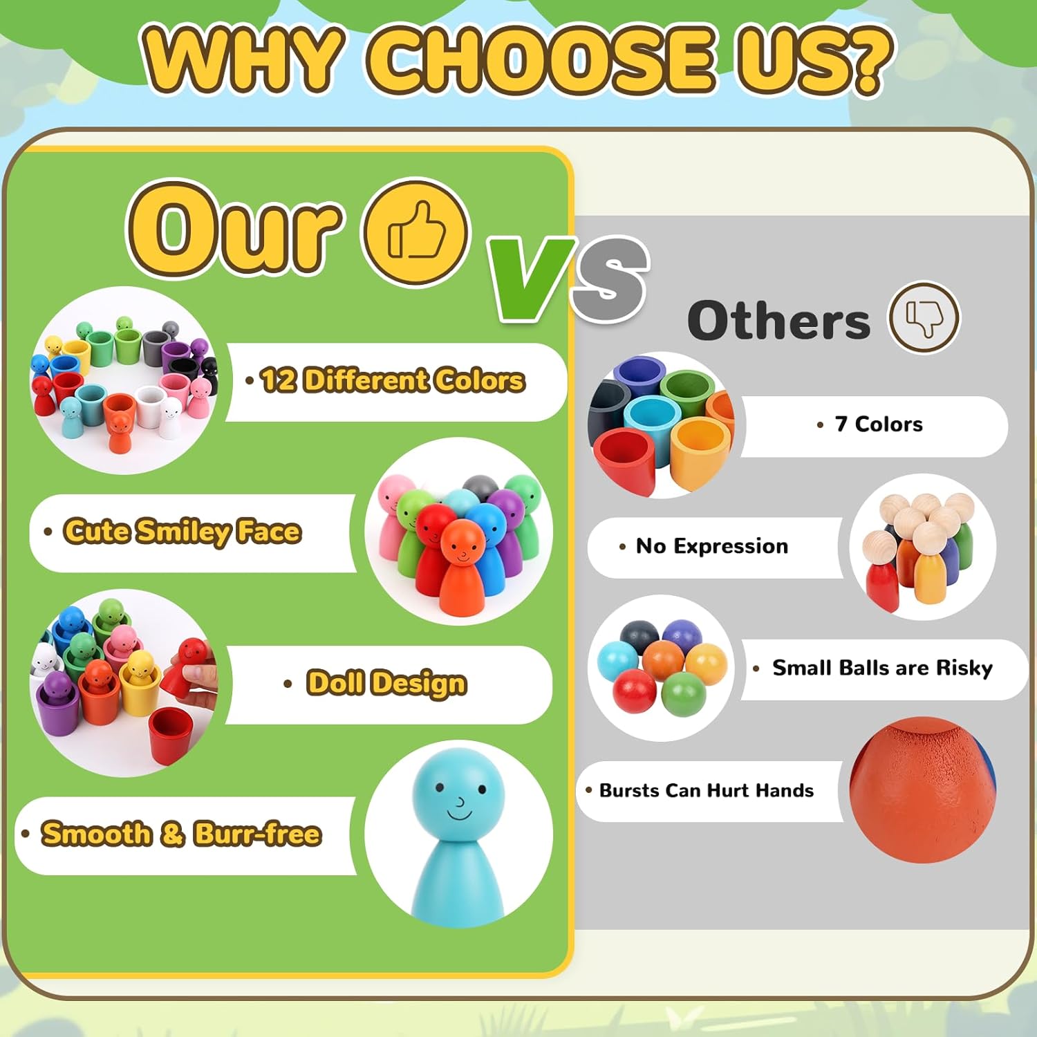 Acest joc educativ Montessori de sortare și asociere pe culori este conceput pentru a sprijini dezvoltarea cognitivă și emoțională a copiilor începând cu vârsta de 3 ani. Setul include 12 cupe din lemn și 12 figurine asociate, fiecare colorată distinct, pentru a stimula recunoașterea culorilor și coordonarea ochi-mână.