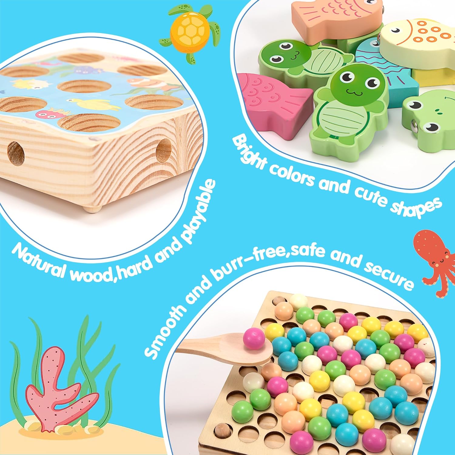 1. Joc de pescuit magnetic: Copilul prinde piese din lemn cu ajutorul undiței, exersând răbdarea și concentrarea.