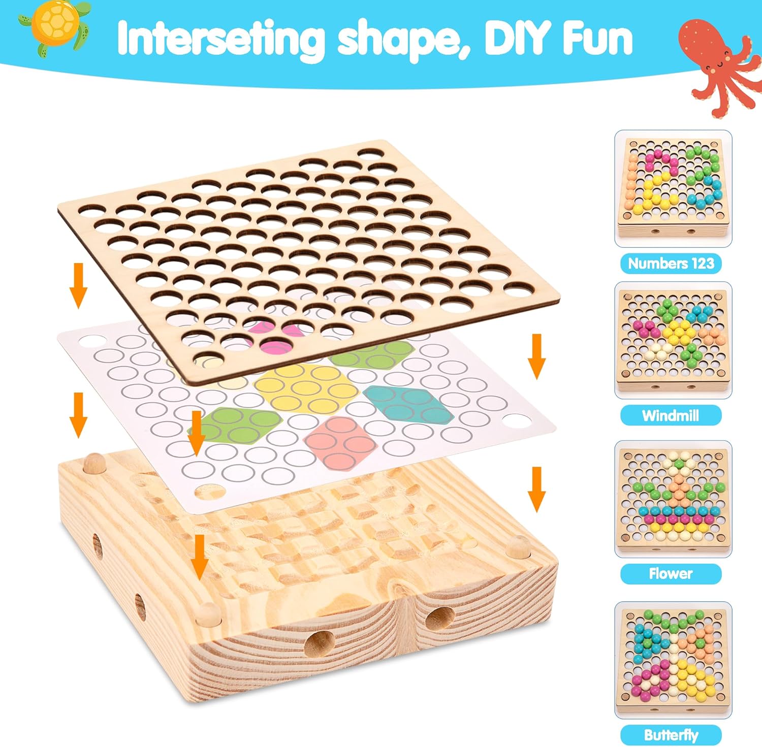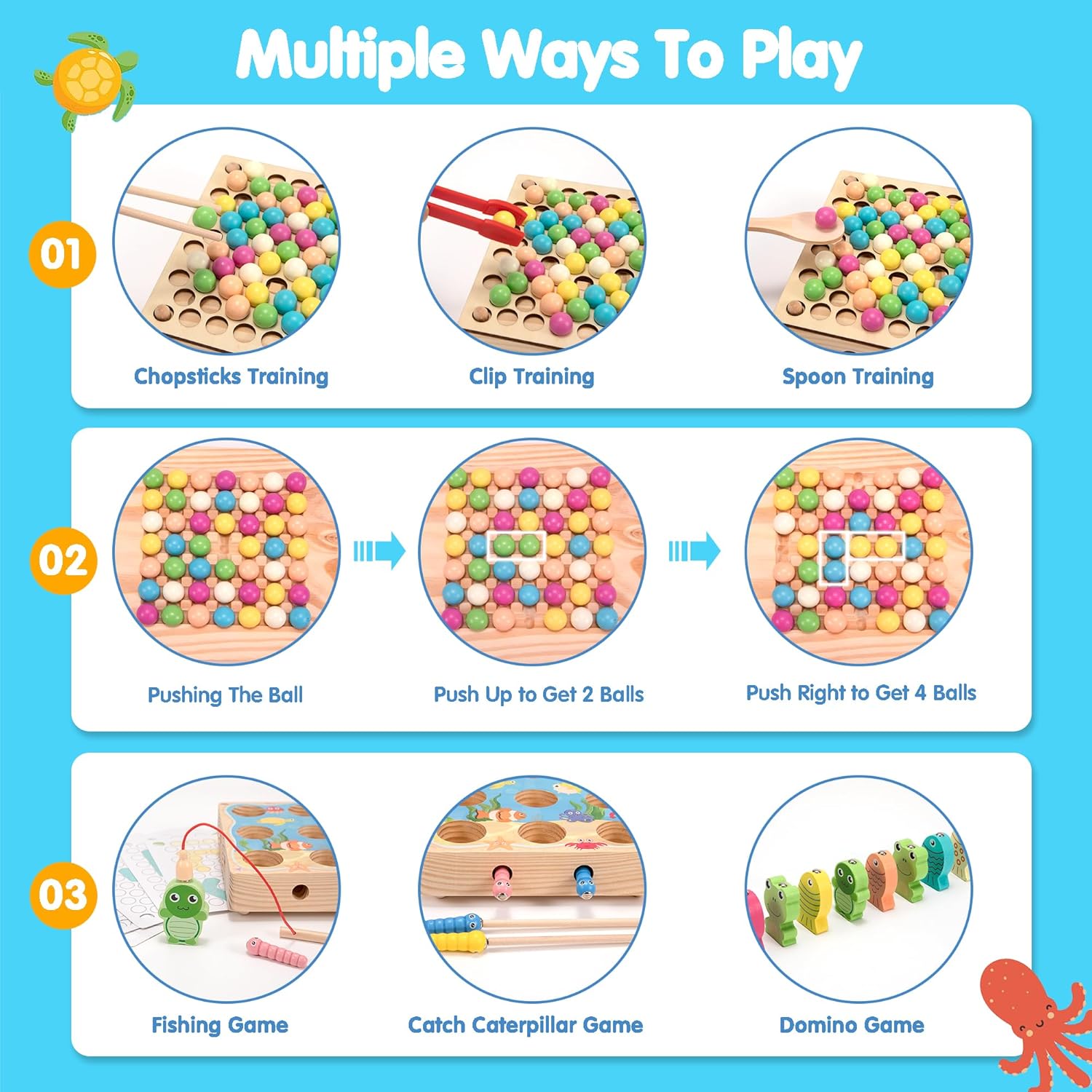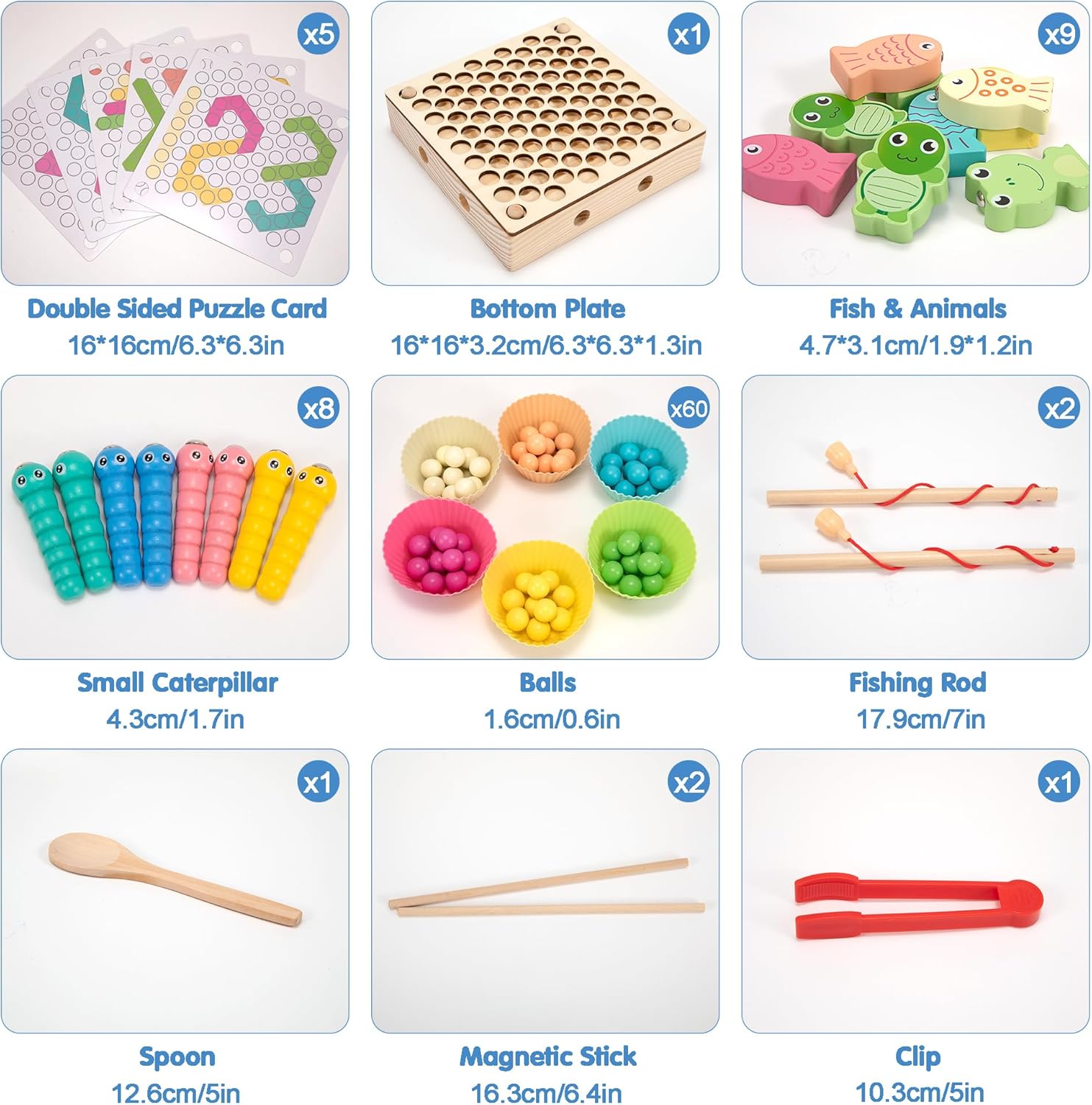Acest joc multifuncțional 4-în-1 este ideal pentru dezvoltarea abilităților motorii fine, coordonării mână-ochi și recunoașterii culorilor, fiind conceput special pentru copiii cu vârsta de peste 3 ani. Conține o bază din lemn cu multiple funcții, 60 de biluțe colorate, pioni în formă de pești și brotăcei, ustensile de prindere și cartonașe ilustrate cu modele educative.