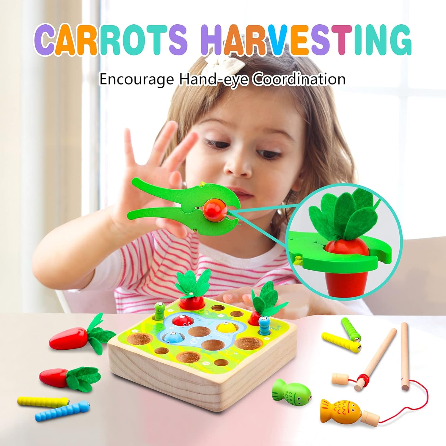 Recoltarea morcovilor – copilul folosește cleștele pentru a scoate morcovii din găuri, antrenând motricitatea fină și forța de prindere.