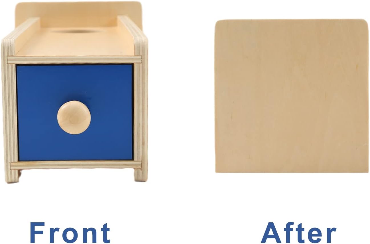 Modalitate de utilizare: Copilul plasează bila din lemn în orificiul cutiei și observă cum aceasta dispare. Pentru a o recupera, trebuie să deschidă sertarul și să găsească bila, exersând astfel coordonarea mână-ochi și învățând despre permanența obiectelor. Acest exercițiu simplu poate fi repetat de mai multe ori, stimulând curiozitatea și dezvoltarea gândirii logice.